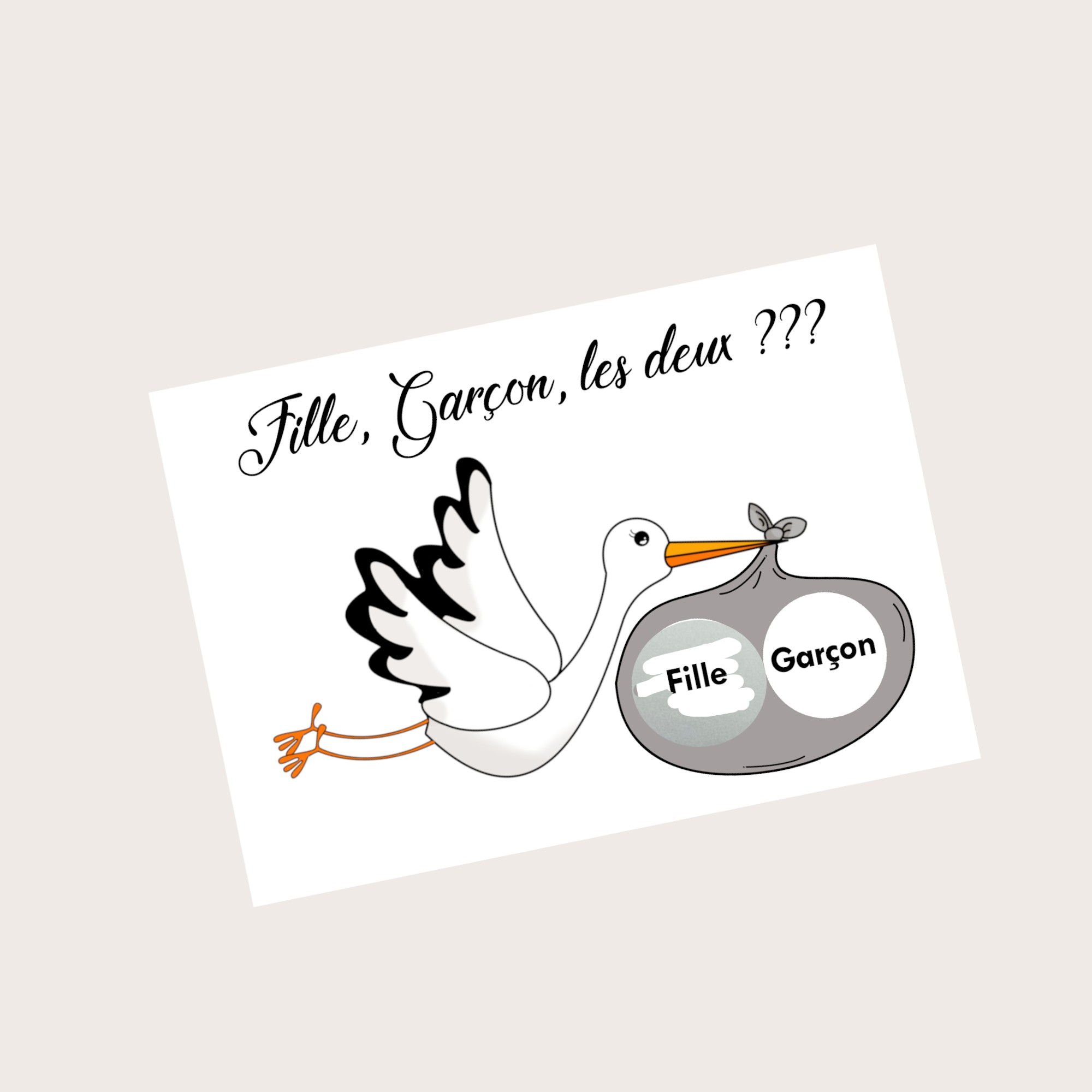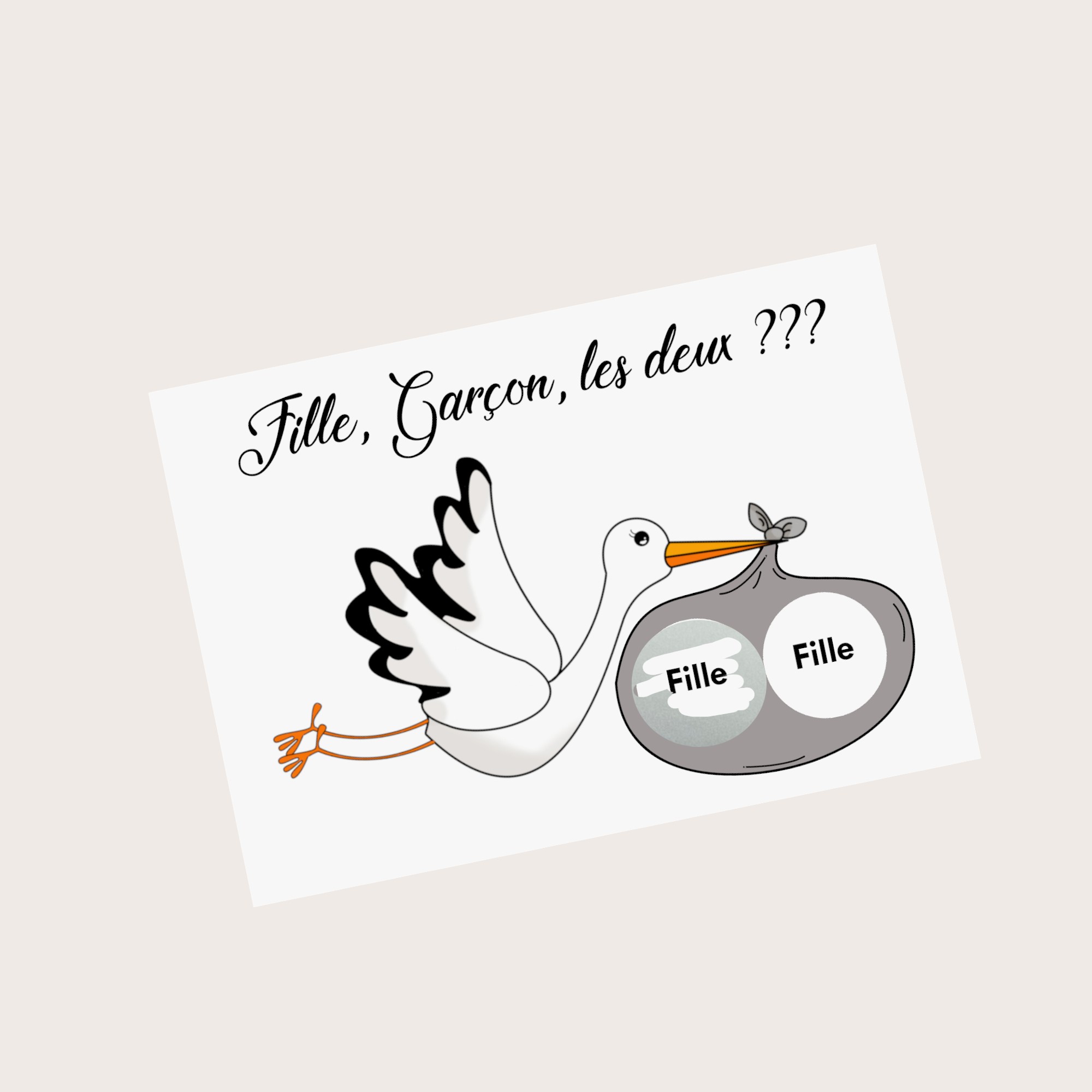 Carte avec pastille à gratter qui permettra d'annonce le sexe des bébés pour annoncer de façon originale votre grossesse gémellaire.