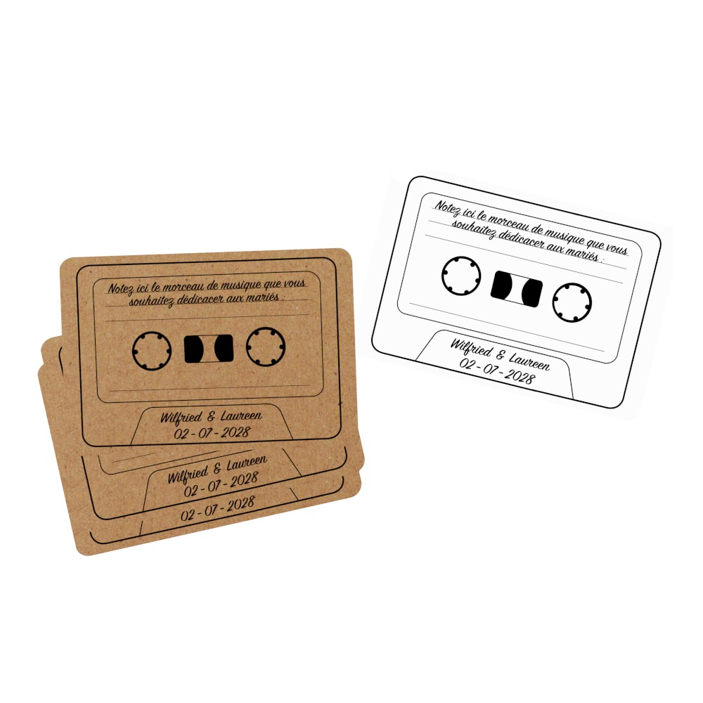 Lot de 10 Cartes style K7 avec emplacement pour écrire le nom d'une chanson que l'on souhaite dédicacer aux mariés ou tout simplement l'entendre.