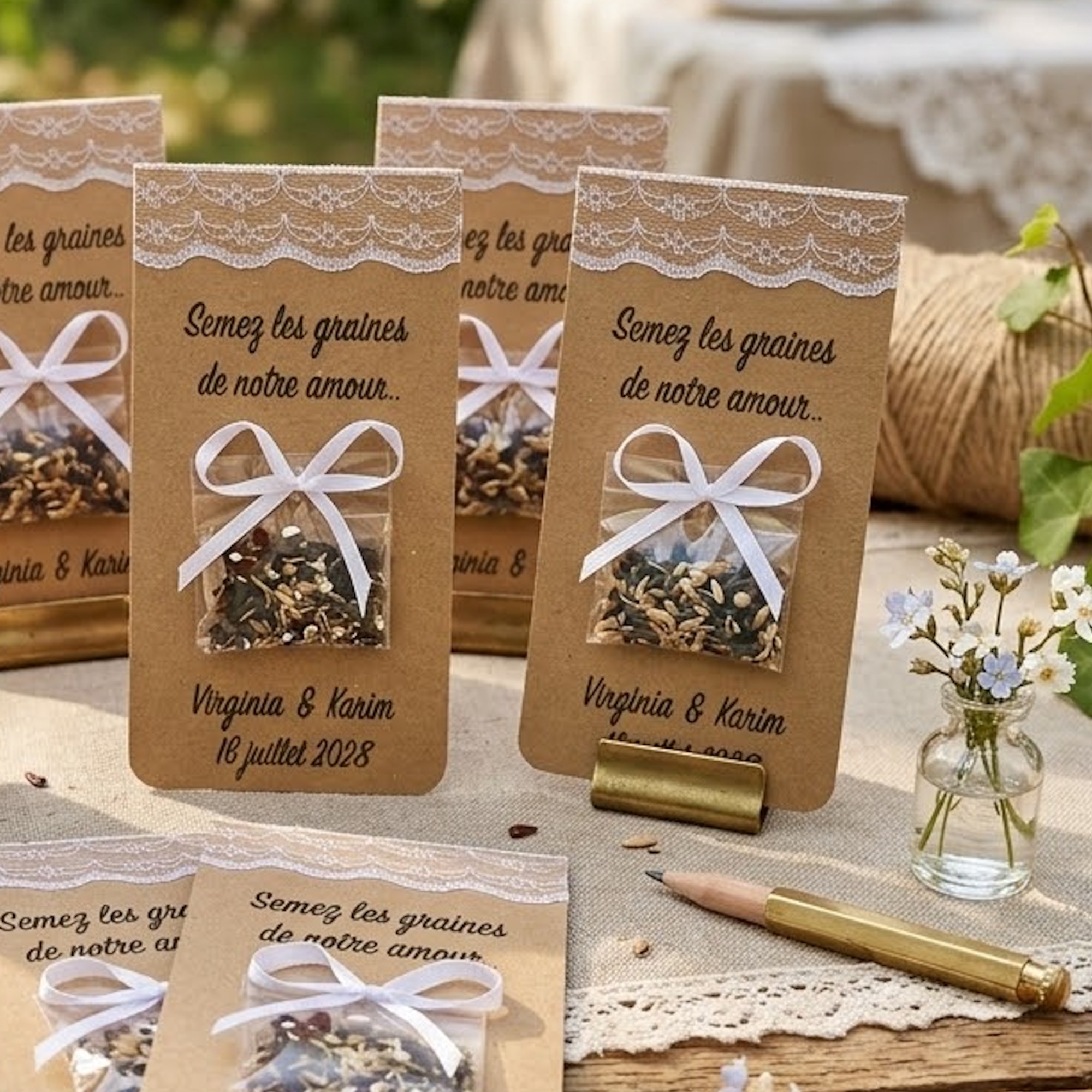 Cadeau de remerciements pour vos invités, éco-responsable et original pour mariage Champêtre, bohème chic. Carte avec un sachet contenant un mélange de graines de fleurs des champs que vos invités pourront semez.