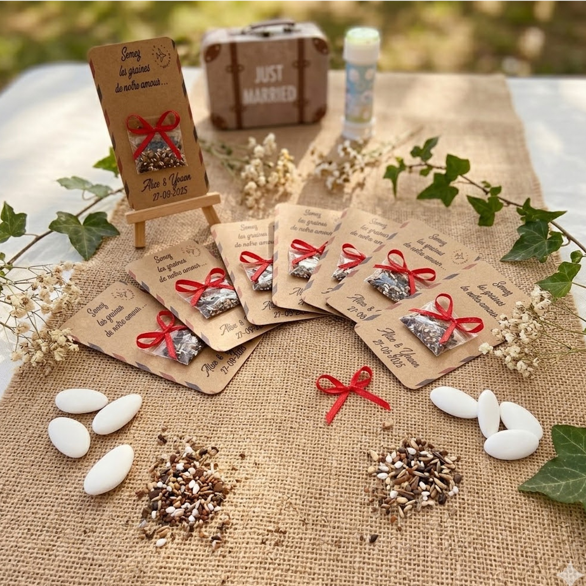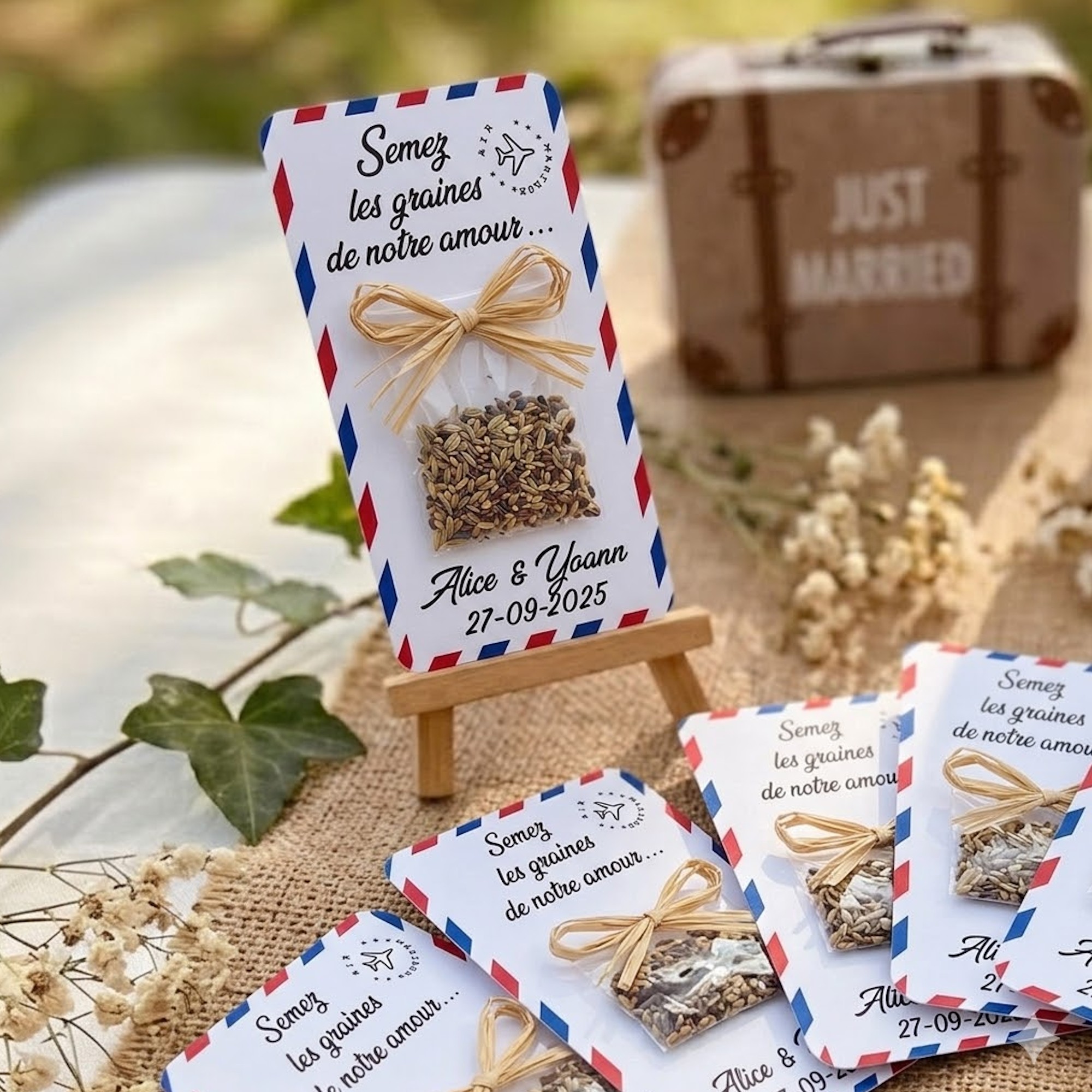 Cadeau de remerciements pour vos invités, éco-responsable et original pour mariage thème Voyage/Destination. Carte avec un sachet contenant un mélange de graines de fleurs des champs que vos invités pourront semez.
