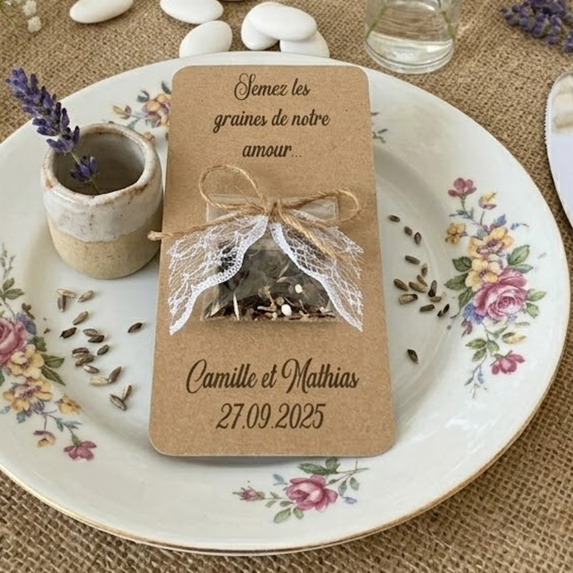 GRAINES À SEMER - CADEAUX REMERCIEMENTS INVITÉS PERSONNALISÉS POUR MARIAGE CHAMPÊTRE, BOHÈME - KRAFT ET DENTELLE