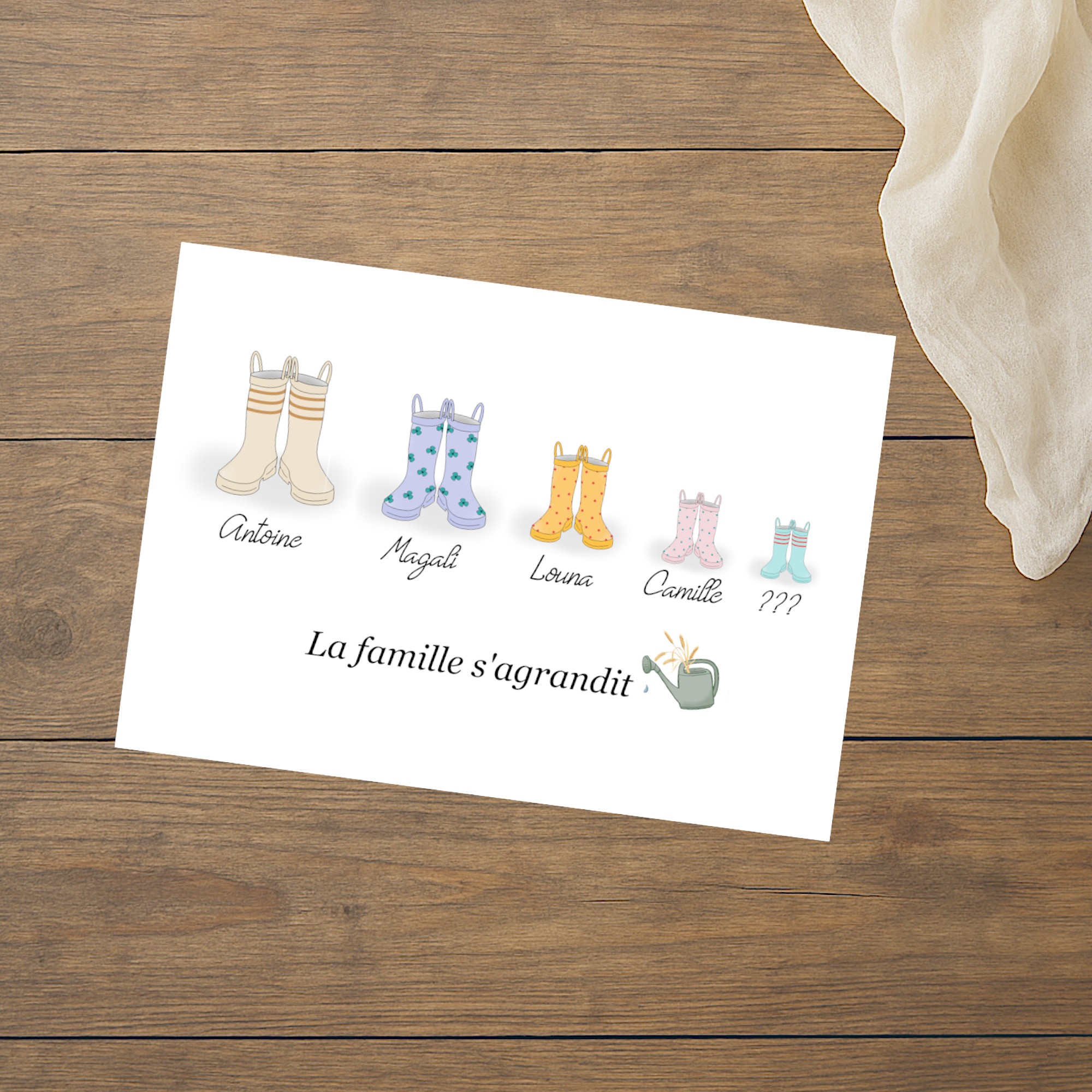 Carte est à personnaliser avec le nombre de bottes qui composent votre famille, la couleur et le motif des bottes ainsi que le prénom des membres de votre famille.