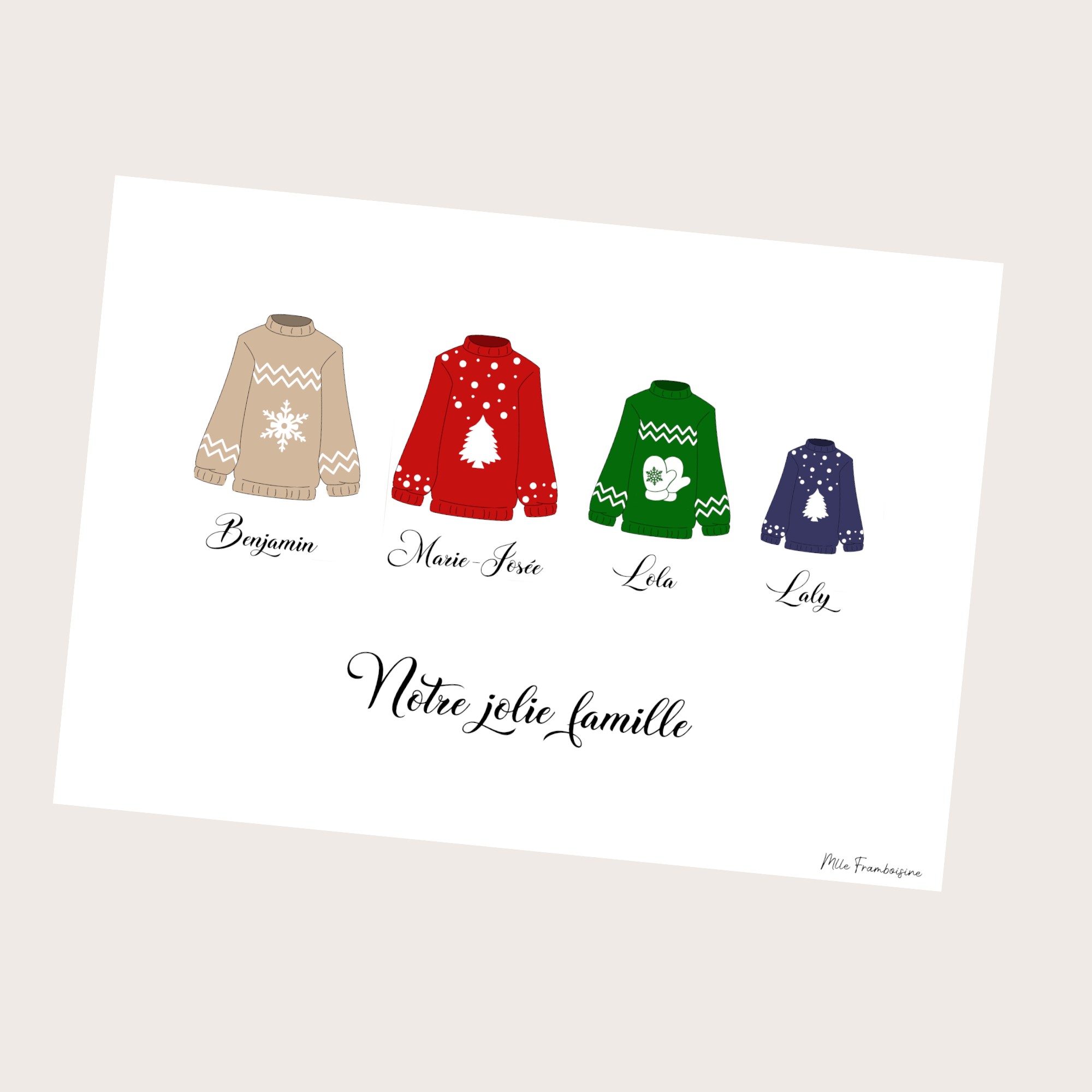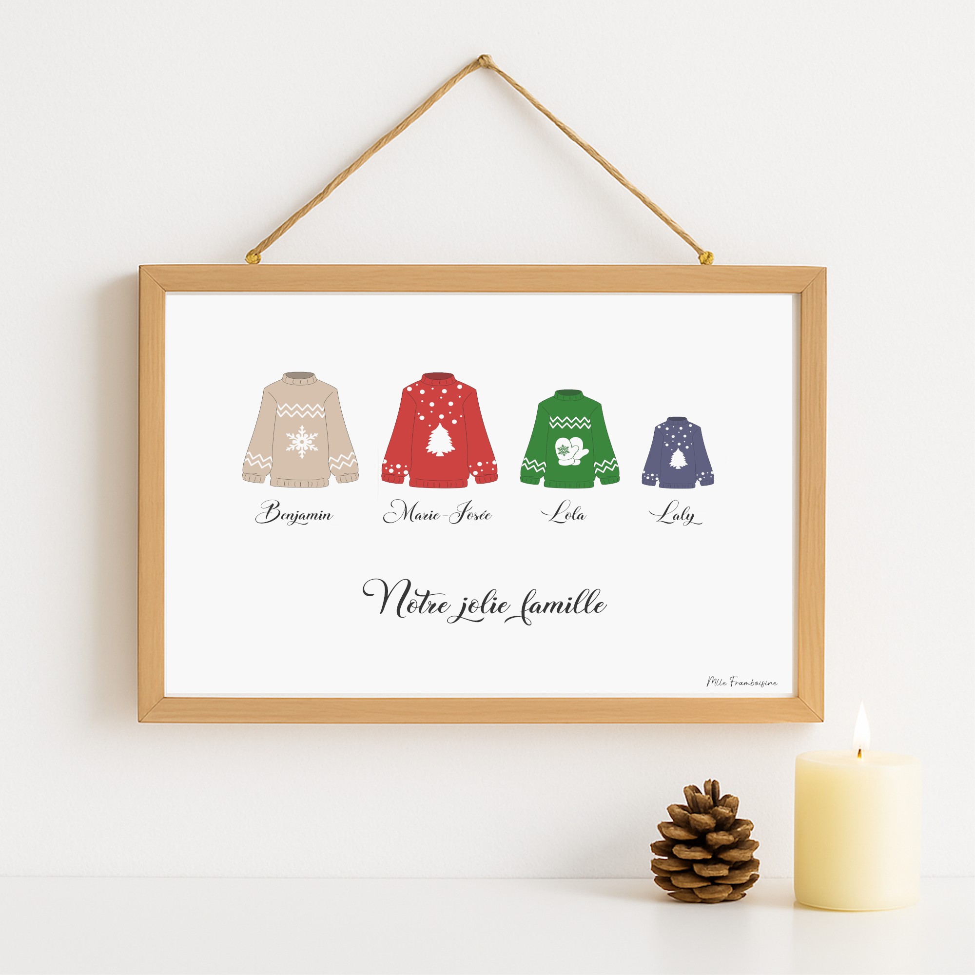 Voici une affiche personnalisée avec le nombre de pulls qui composent votre famille ainsi que le prénom de chacun qui fera une décoration de Noël originale.