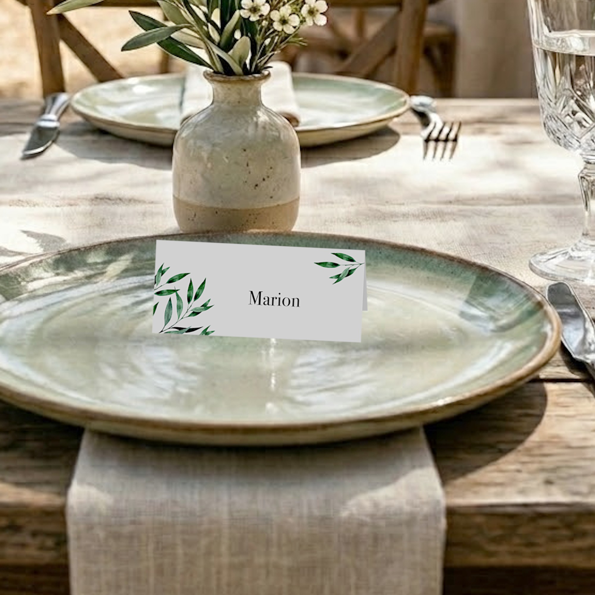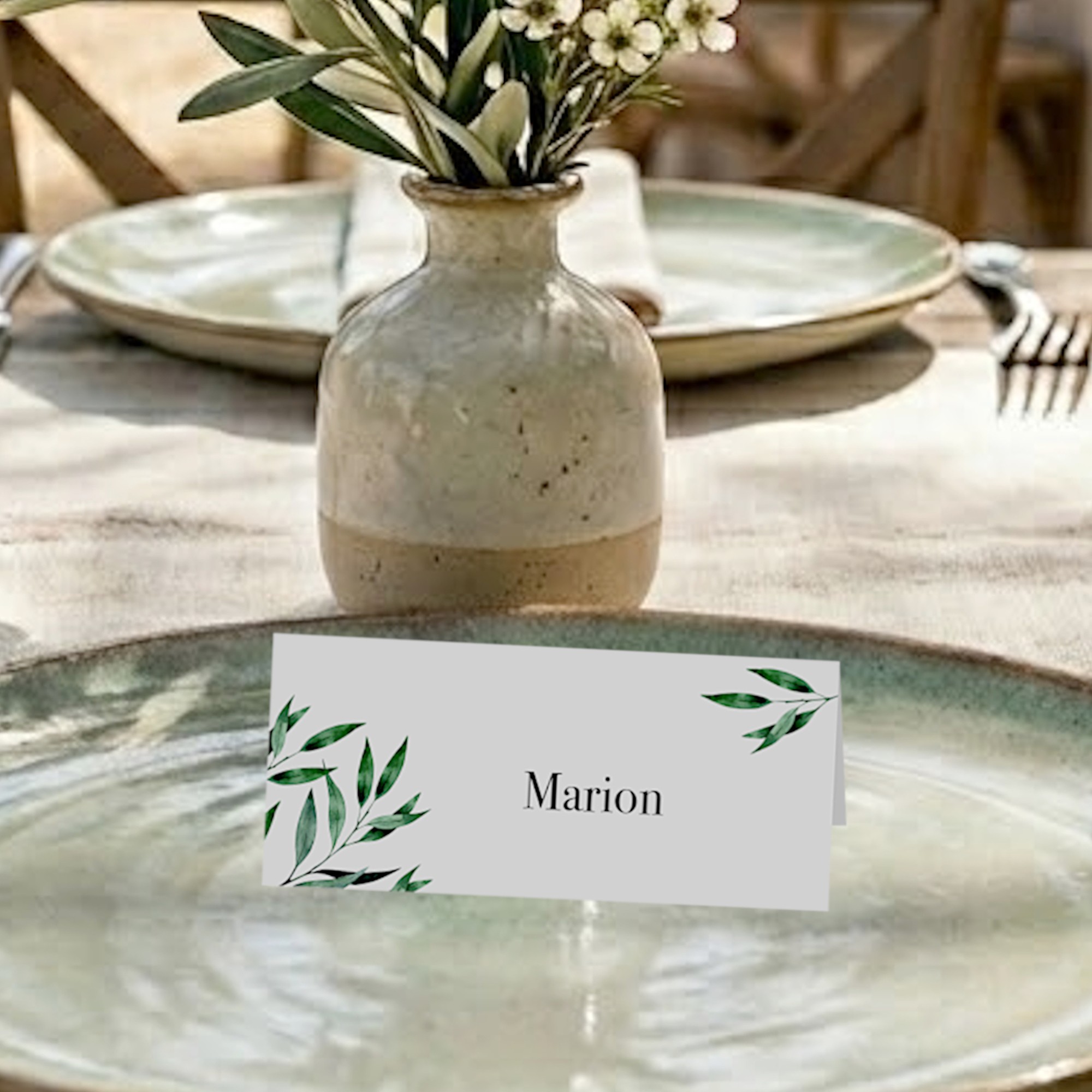 Vous avez choisi le thème de l'olivier pour votre mariage ? Qu'il s'agisse d'une cérémonie en extérieur, sous le soleil du Sud, ou d'une réception champêtre chic, nos marque-places apportent une touche de fraîcheur végétale à vos tables. Leurs illustrations raffinées de branches d'olivier, réalisées dans des tons verts nuancés, offrent un rendu à la fois sobre et haut de gamme.