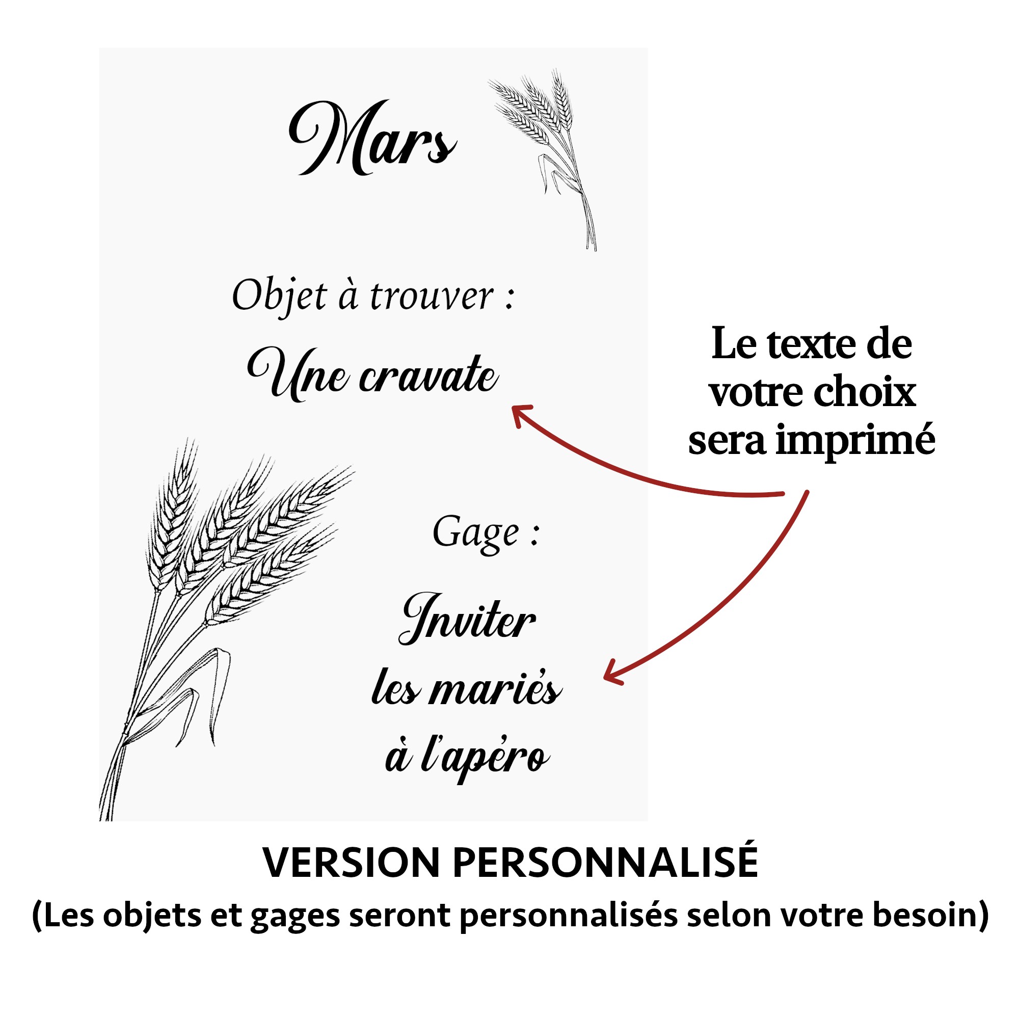 ➢ VERSION PERSONNALISÉE : Vous avez la possibilité de choisir les gages et objets selon votre besoin et nous les imprimerons. (objets et gages à noter en personnalisation)