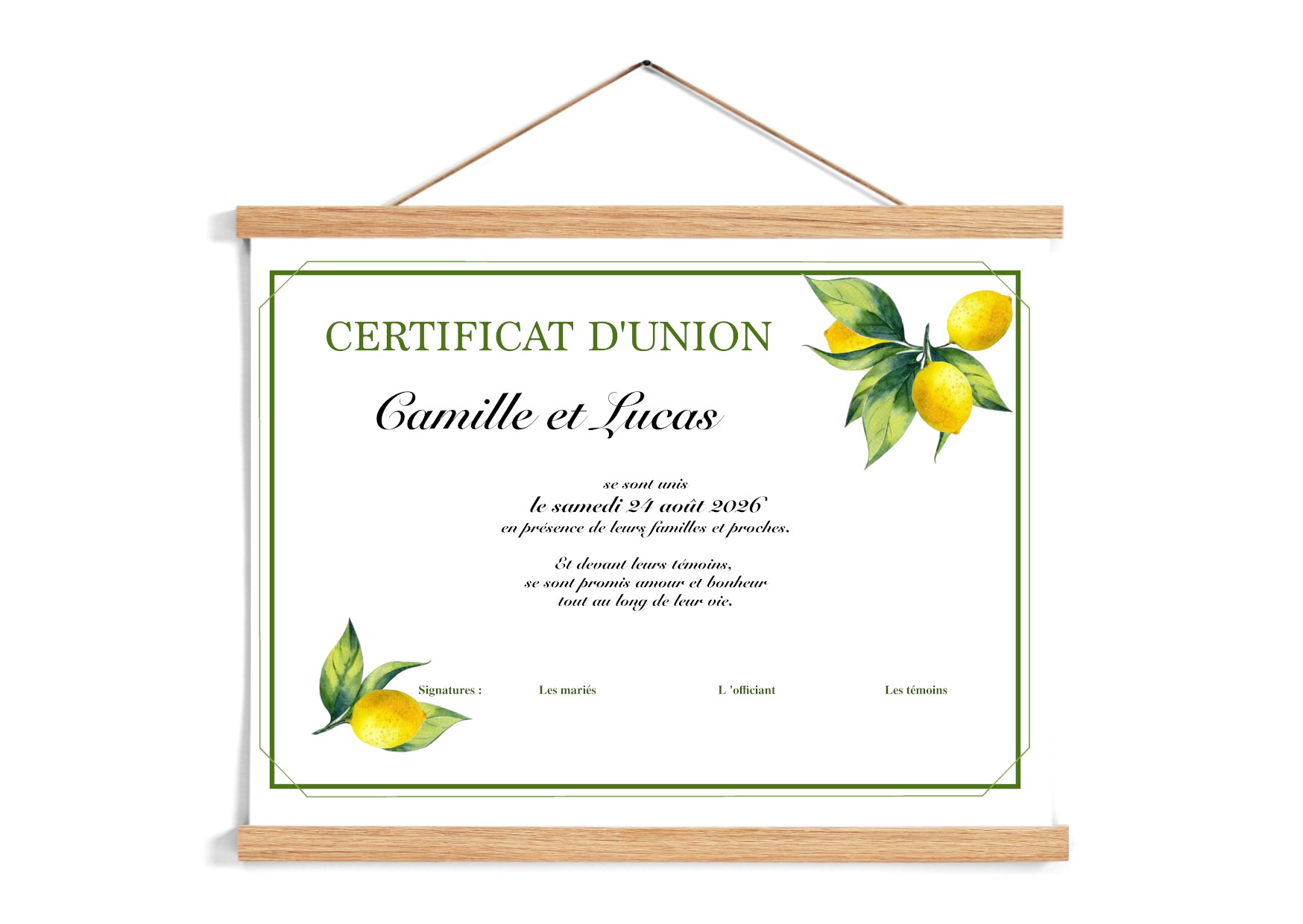 Voici un certificat personnalisé pour votre cérémonie Laïque, qui vous permettra de garder un souvenir précieux de ce joli moment