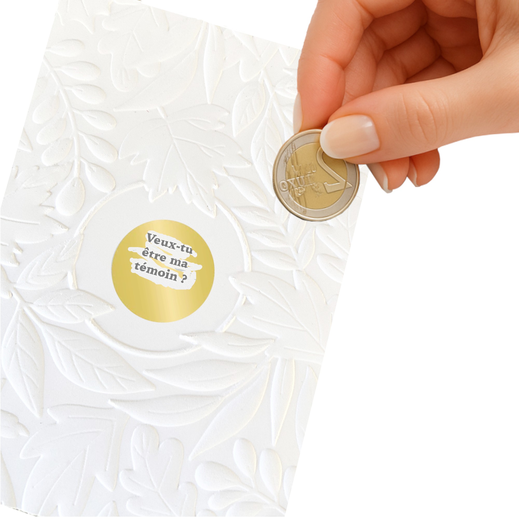 Carte à gratter aux jolis motifs floraux en relief, idéale pour faire sa demande de témoin, demoiselle d'honneur ou encore marraine de façon originale. Au centre de la carte la pastille ronde couleur or est à gratter pour y découvrir votre texte personnalisé.
