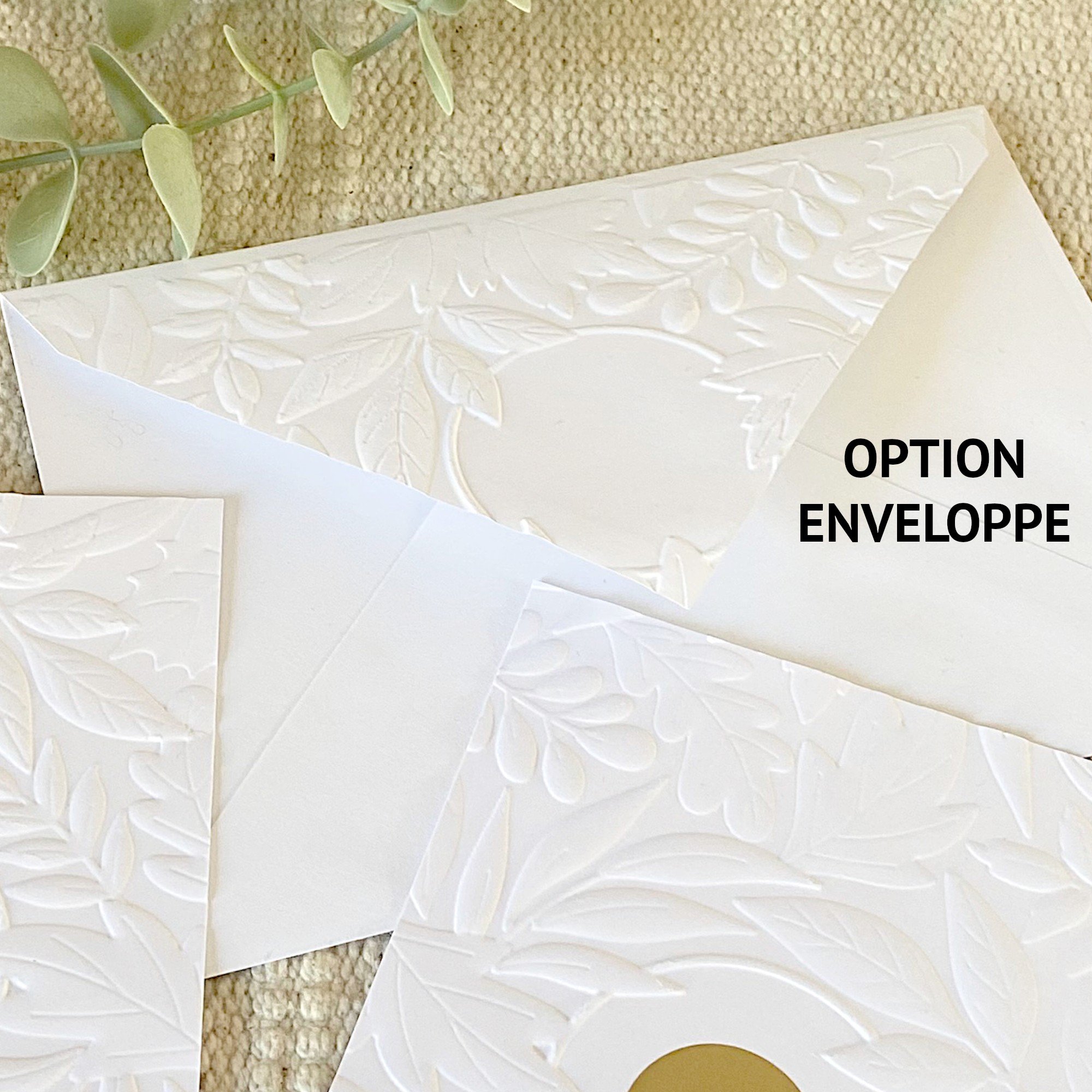- Avec une enveloppe blanche dont le rabat est aux motifs floraux en relief.