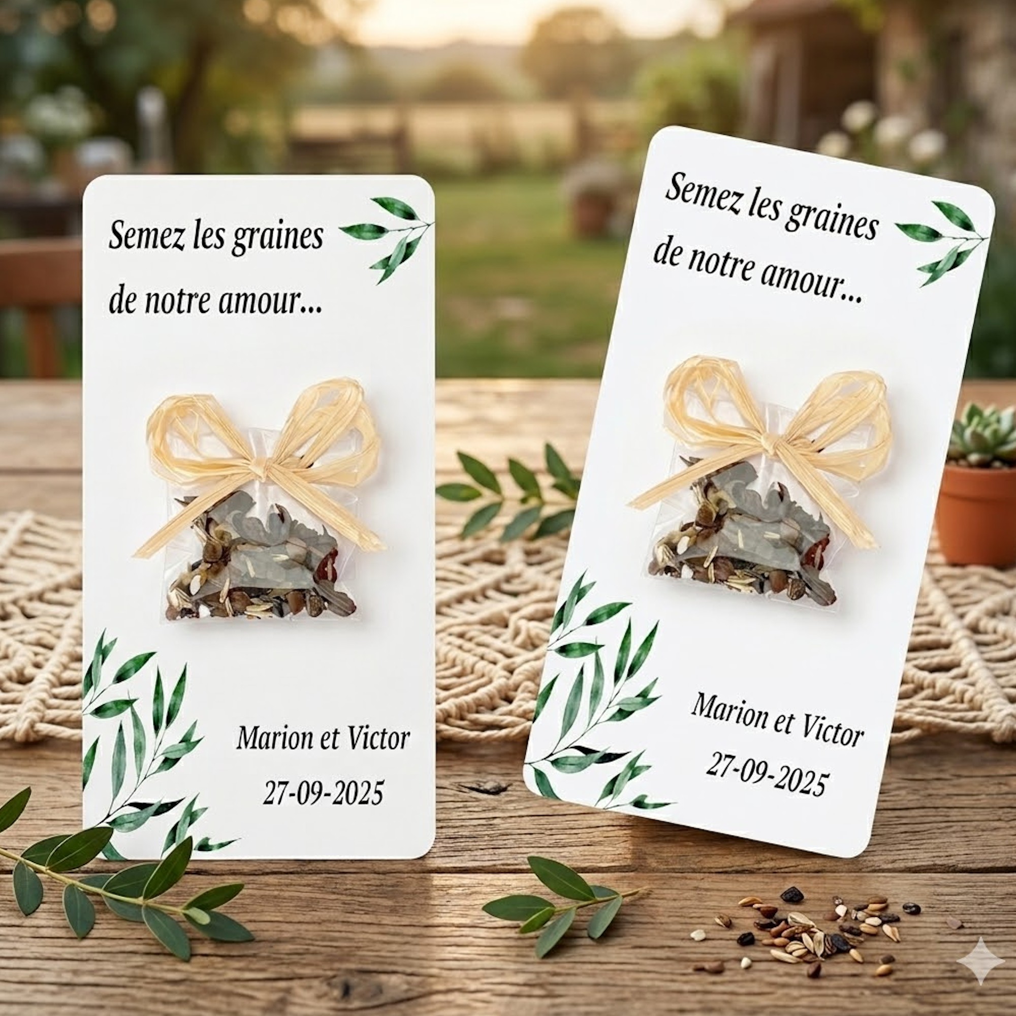 Sur le haut de la carte : "Semez les graines de notre amour..." OU autre texte de votre choix