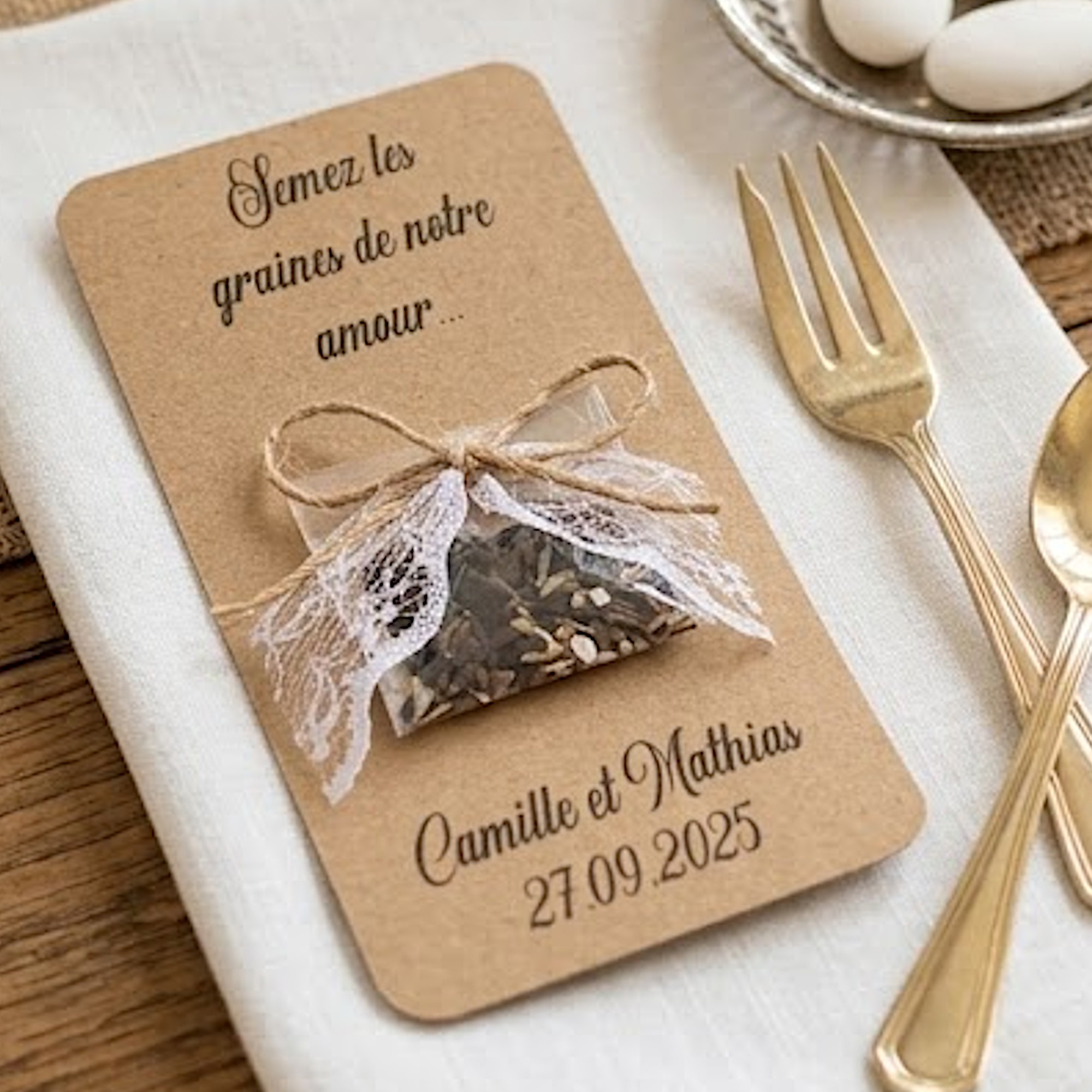 GRAINES À SEMER - CADEAUX REMERCIEMENTS INVITÉS PERSONNALISÉS POUR MARIAGE STYLE CHAMPÊTRE, BOHÈME - MODÈLE KRAFT ET DENTELLE