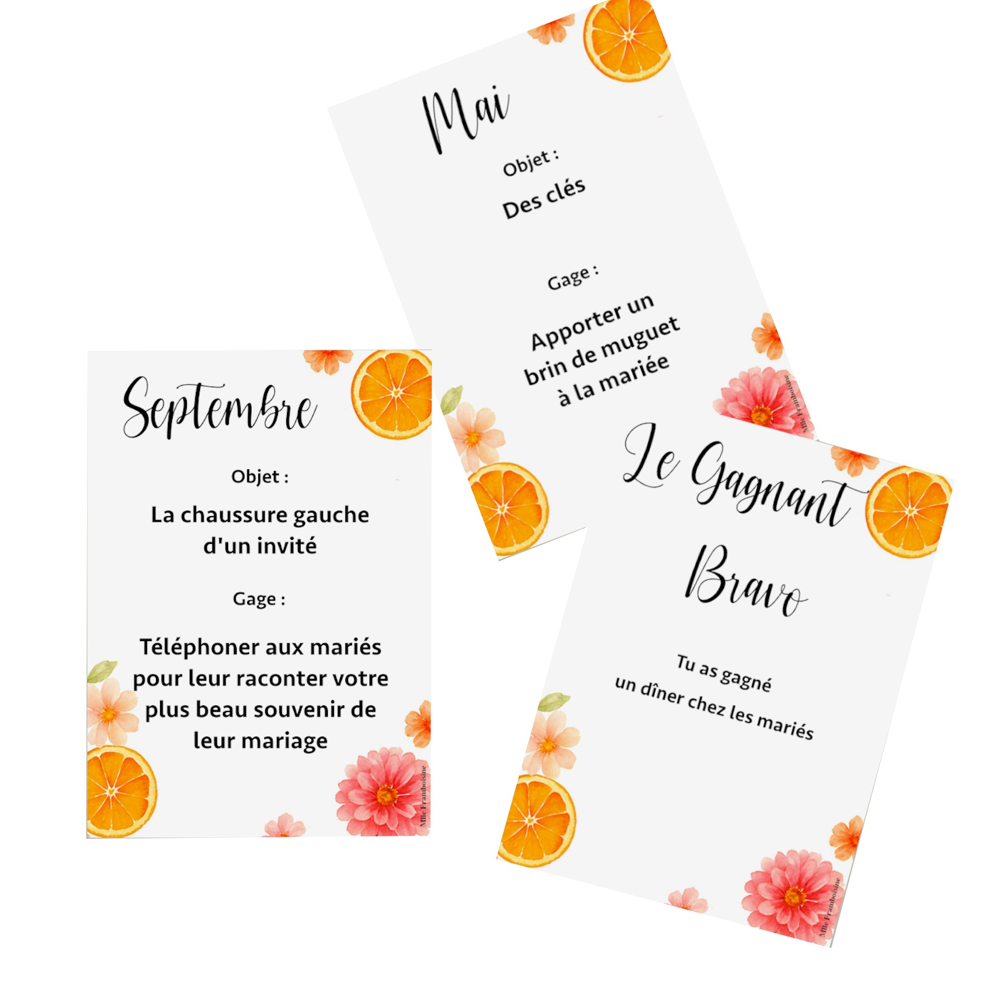 Sur chaque carte 1 mois, 1 objet a rapporter, et 1 gage.