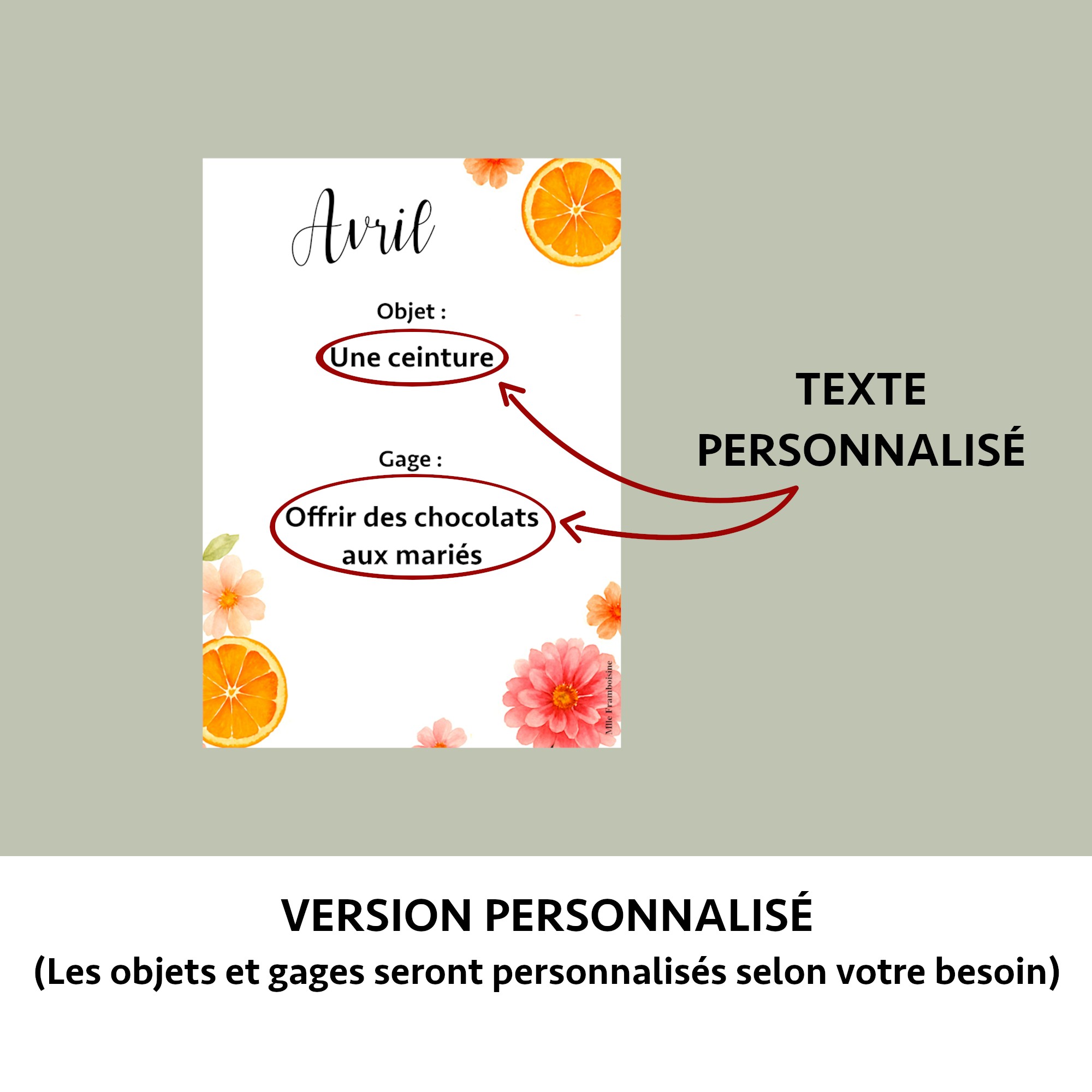 - La version TEXTE PERSONNALISÉ (Les Gages et Ojets sont à personnaliser selon vos besoins)