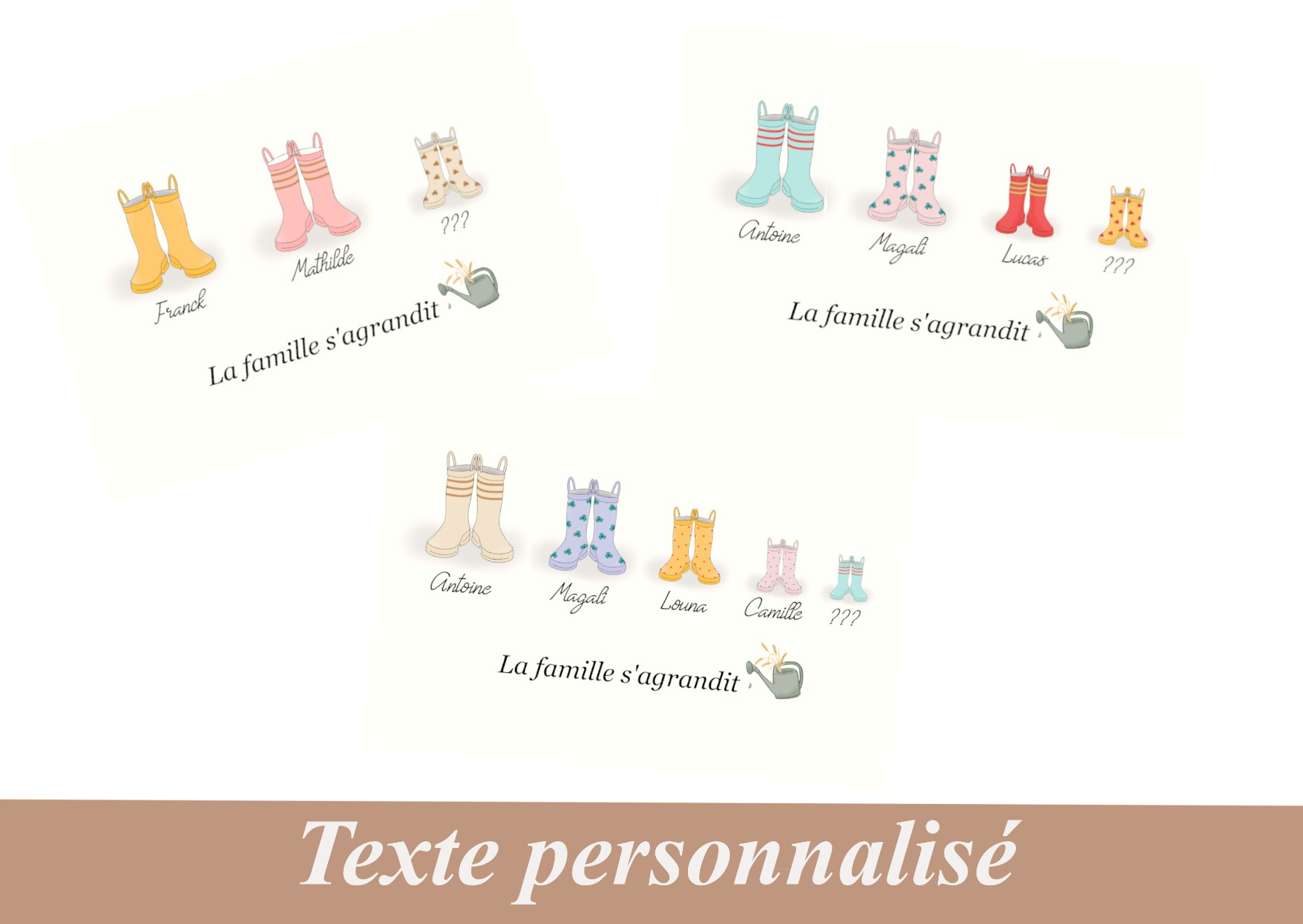 Carte qui vous permettra d'annoncer votre grossesse de manière originale avec le nombre de paires de bottes, leurs modèles, ainsi que les prénoms et la phrase titre de votre choix.