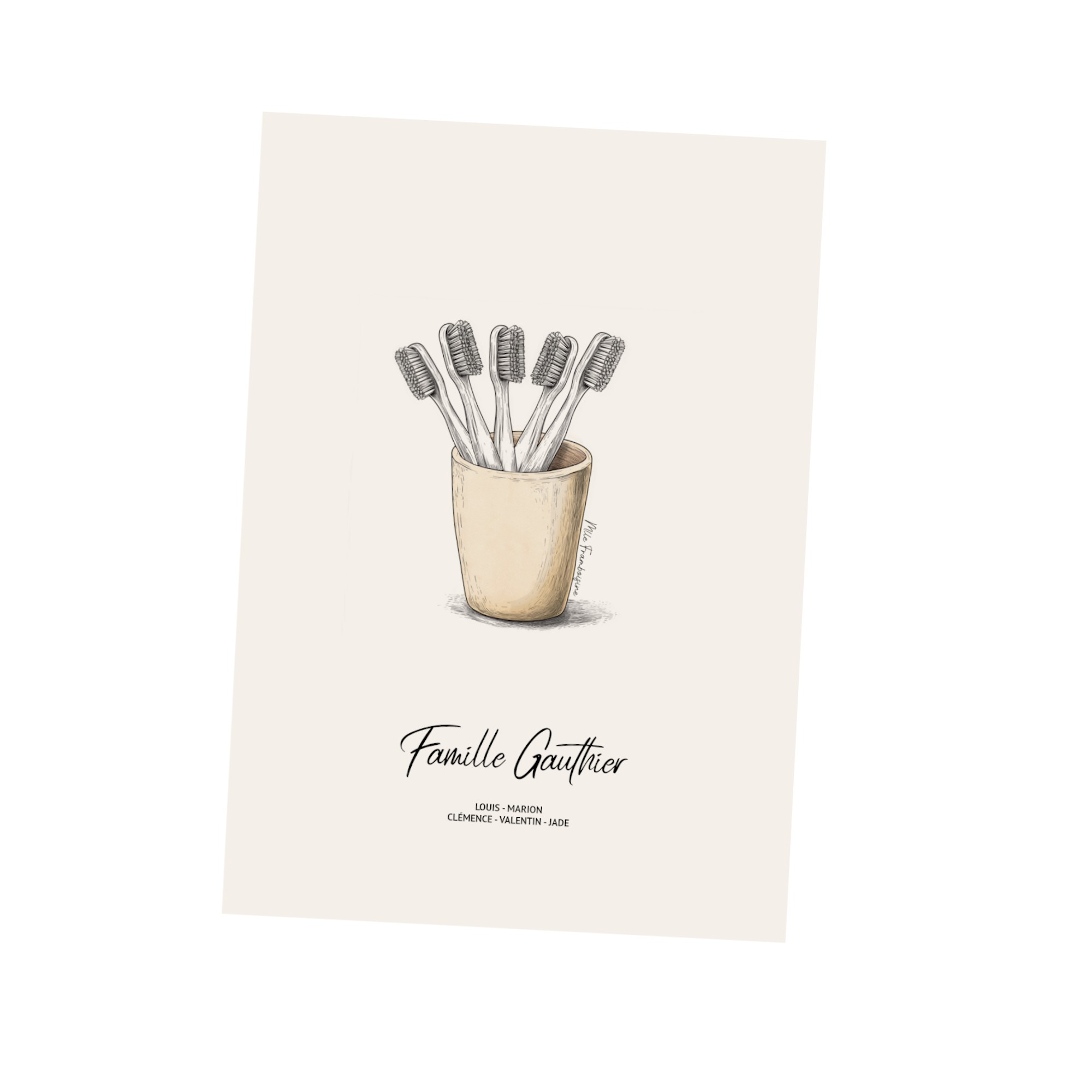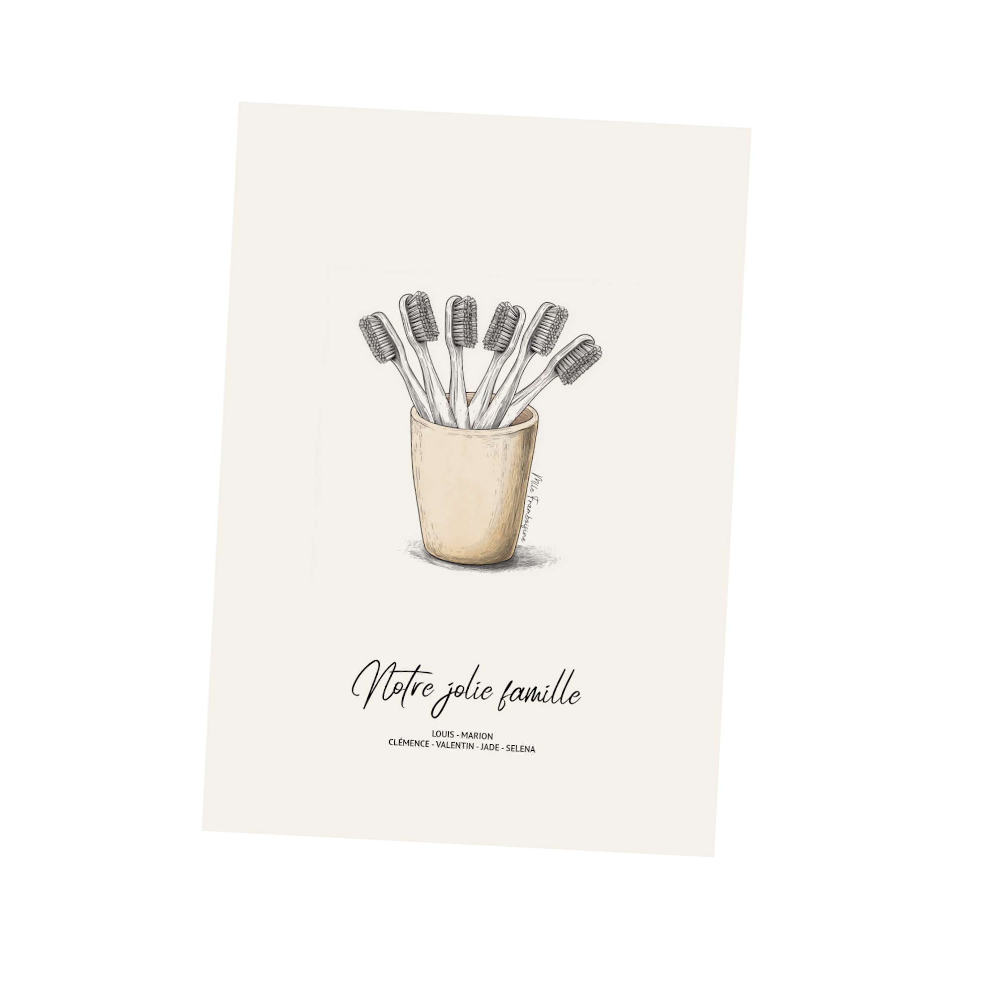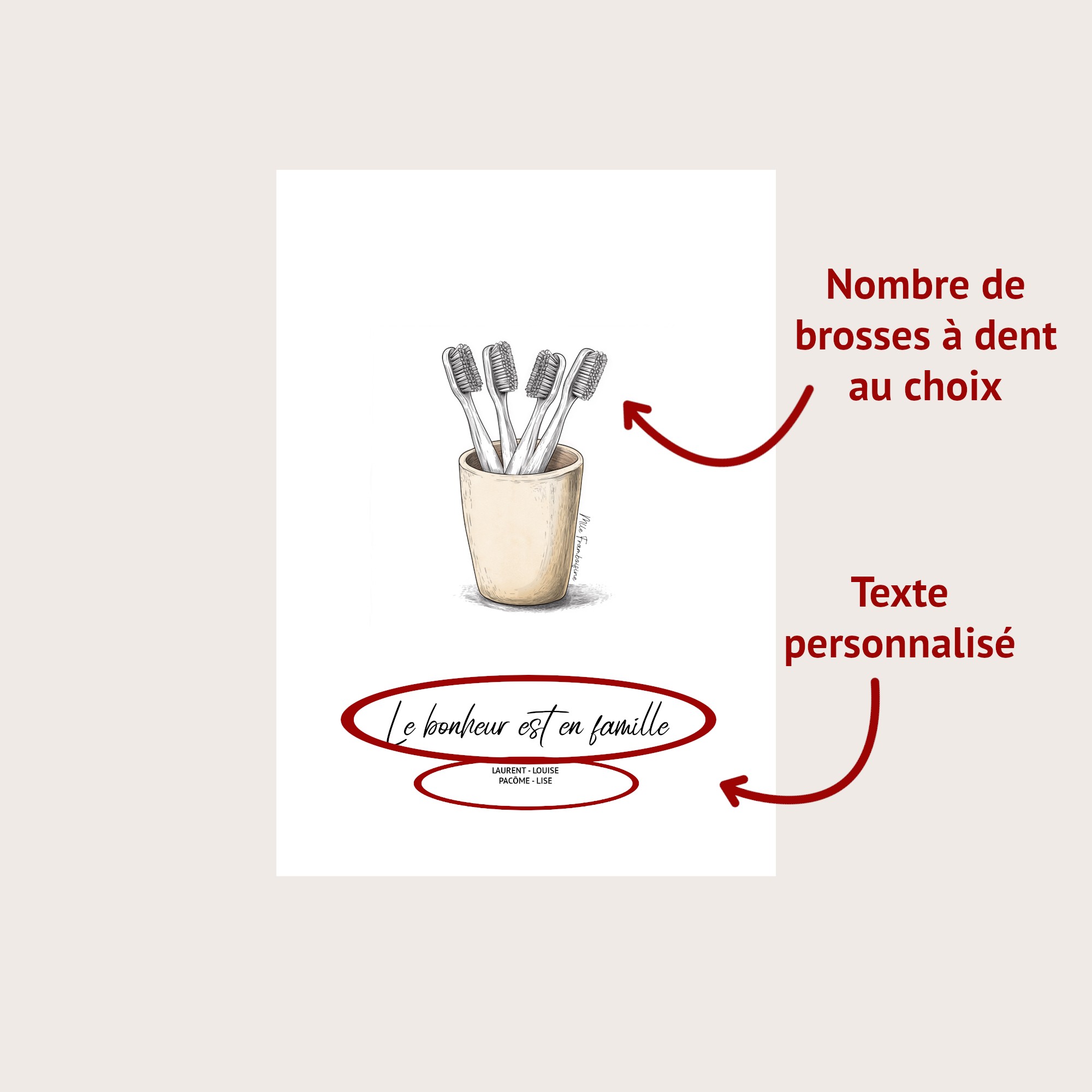Affiche personnalisée avec le nombre de brosses à dent qui composent votre famille ainsi que le prénom sur chacun