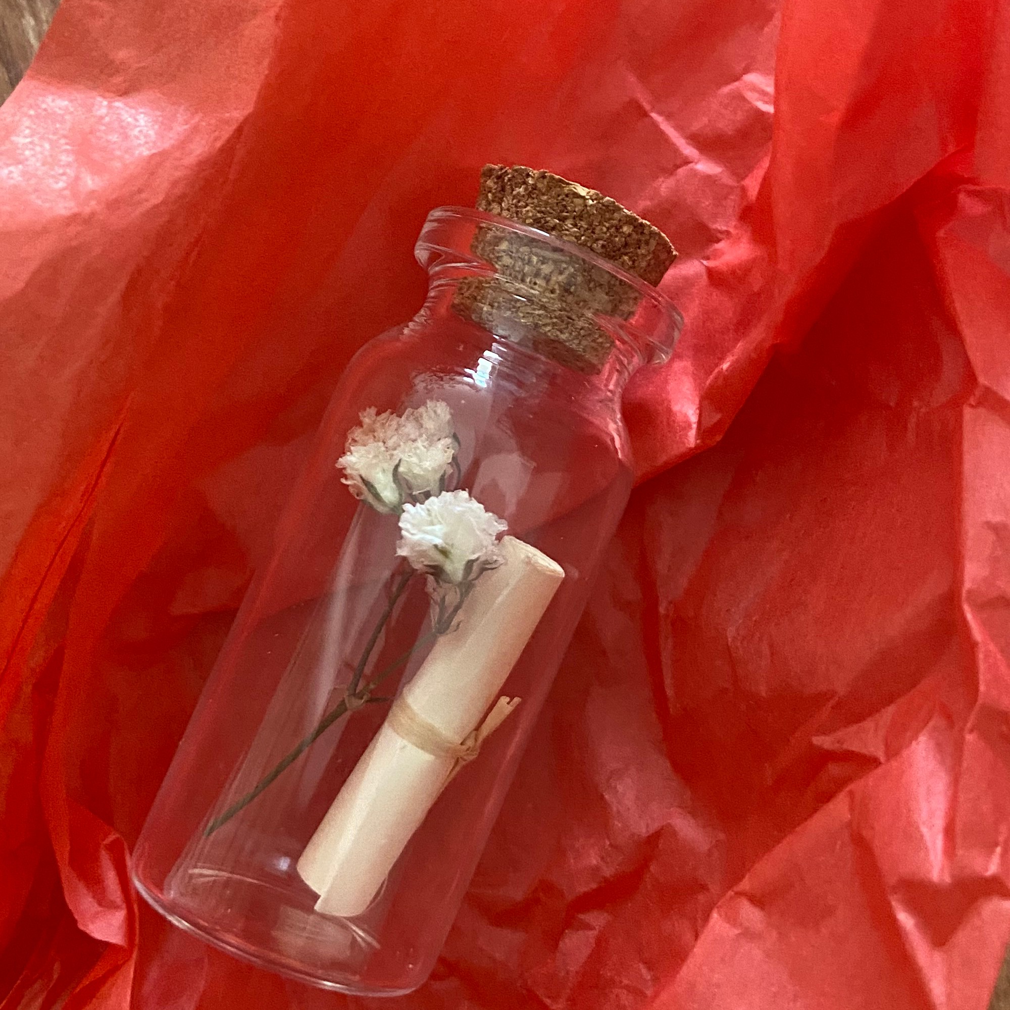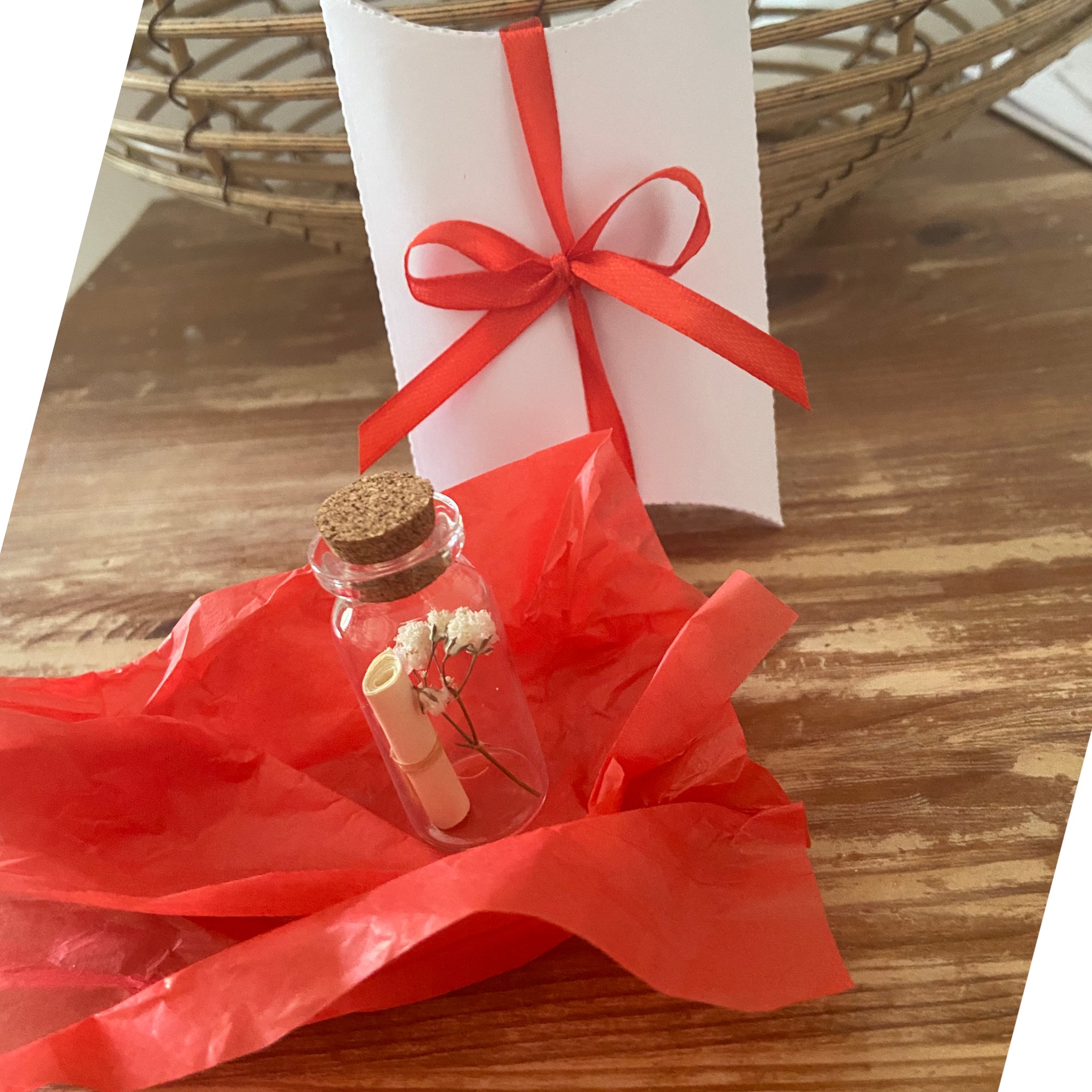 Petite fiole en verre avec à l'intérieur un message personnalisé selon votre besoin, qui vous permettra de faire une annonce surprenante et inoubliable.
