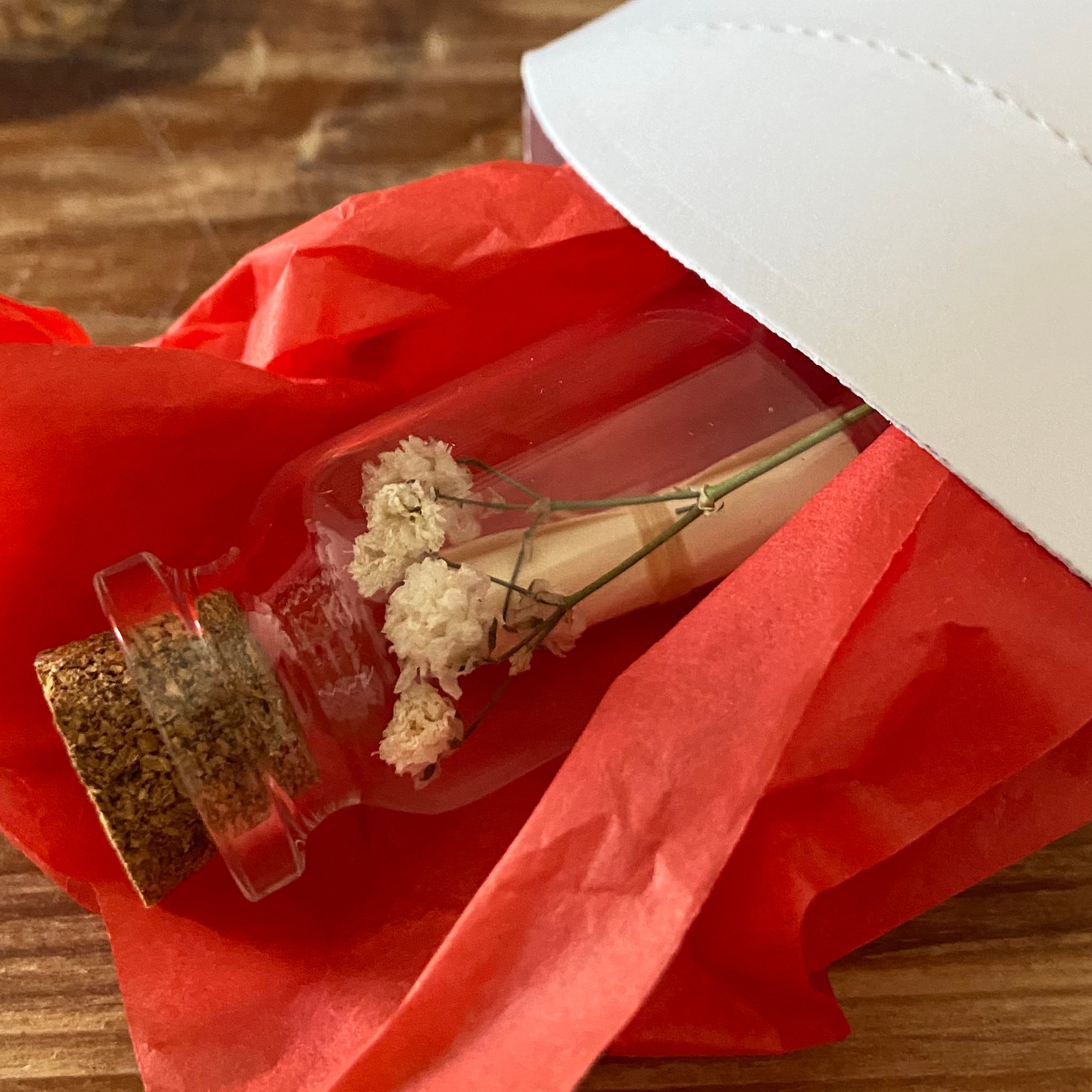 La fiole sera enveloppée dans un papier de soie rouge et glissée dans unboite berlingot blanche.