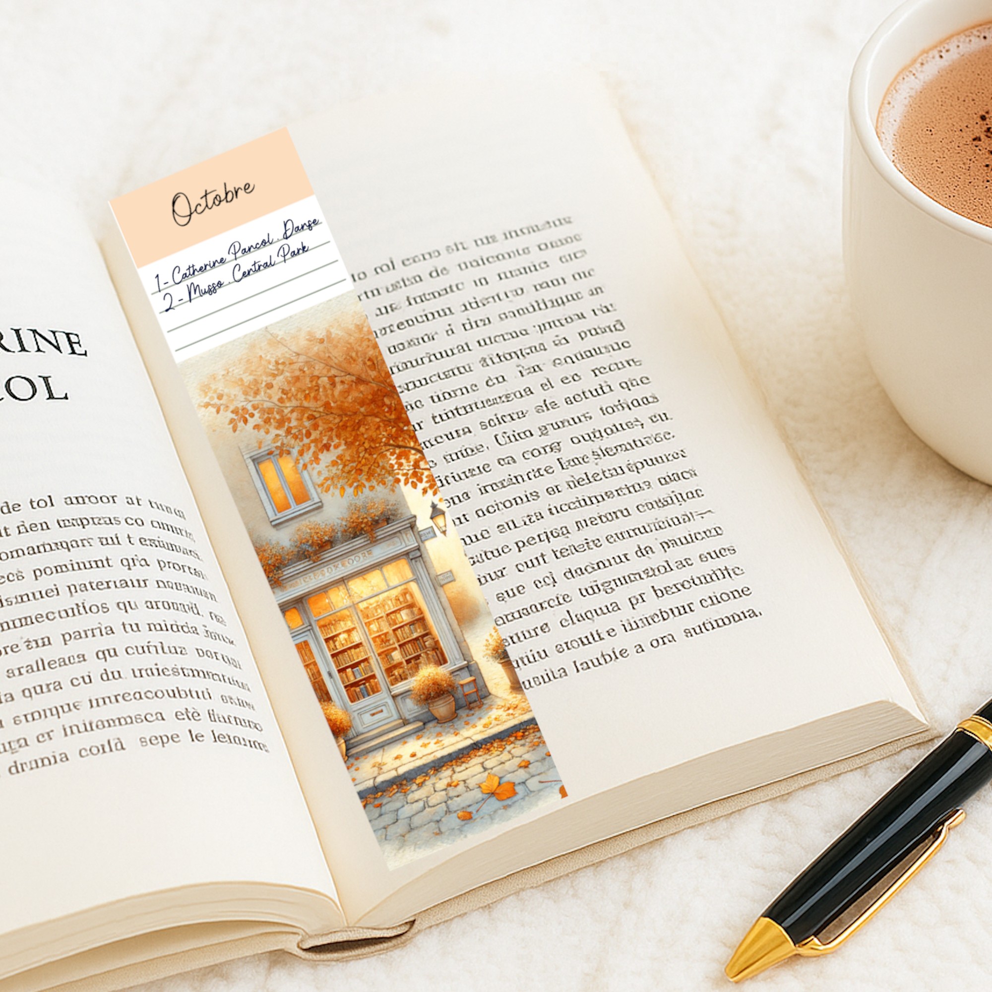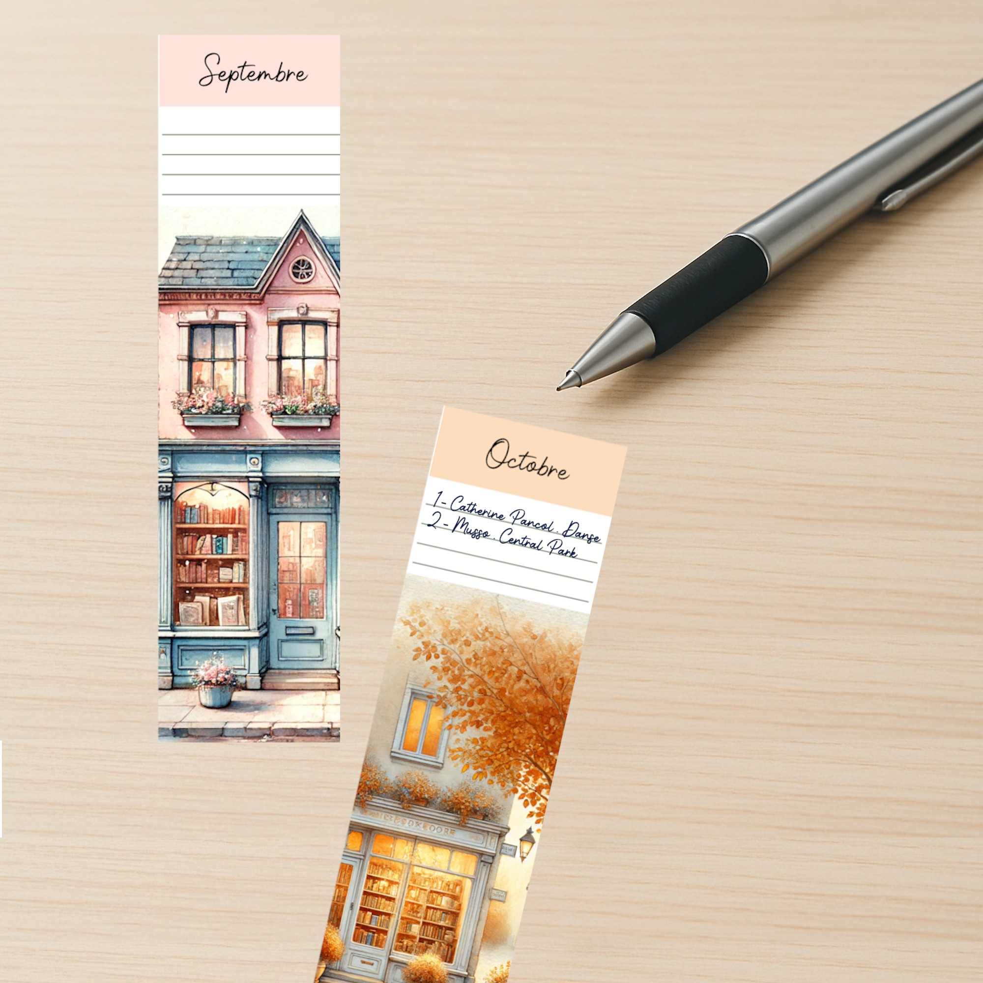 Chaque marque-page contient 4 lignes en haut afin que vous puissiez y inscrire vos lecture du mois.
