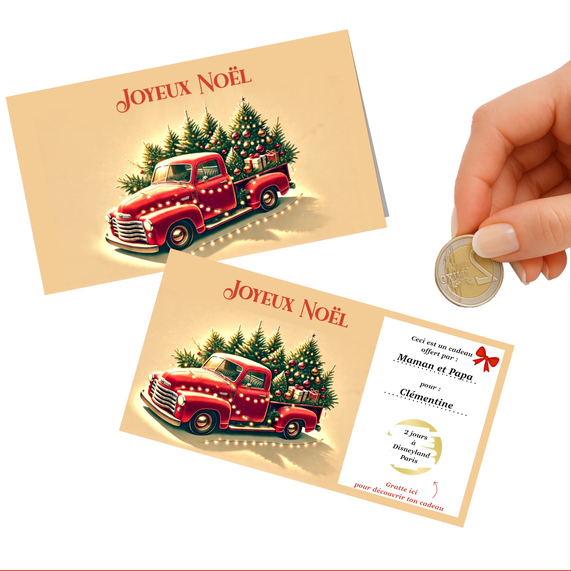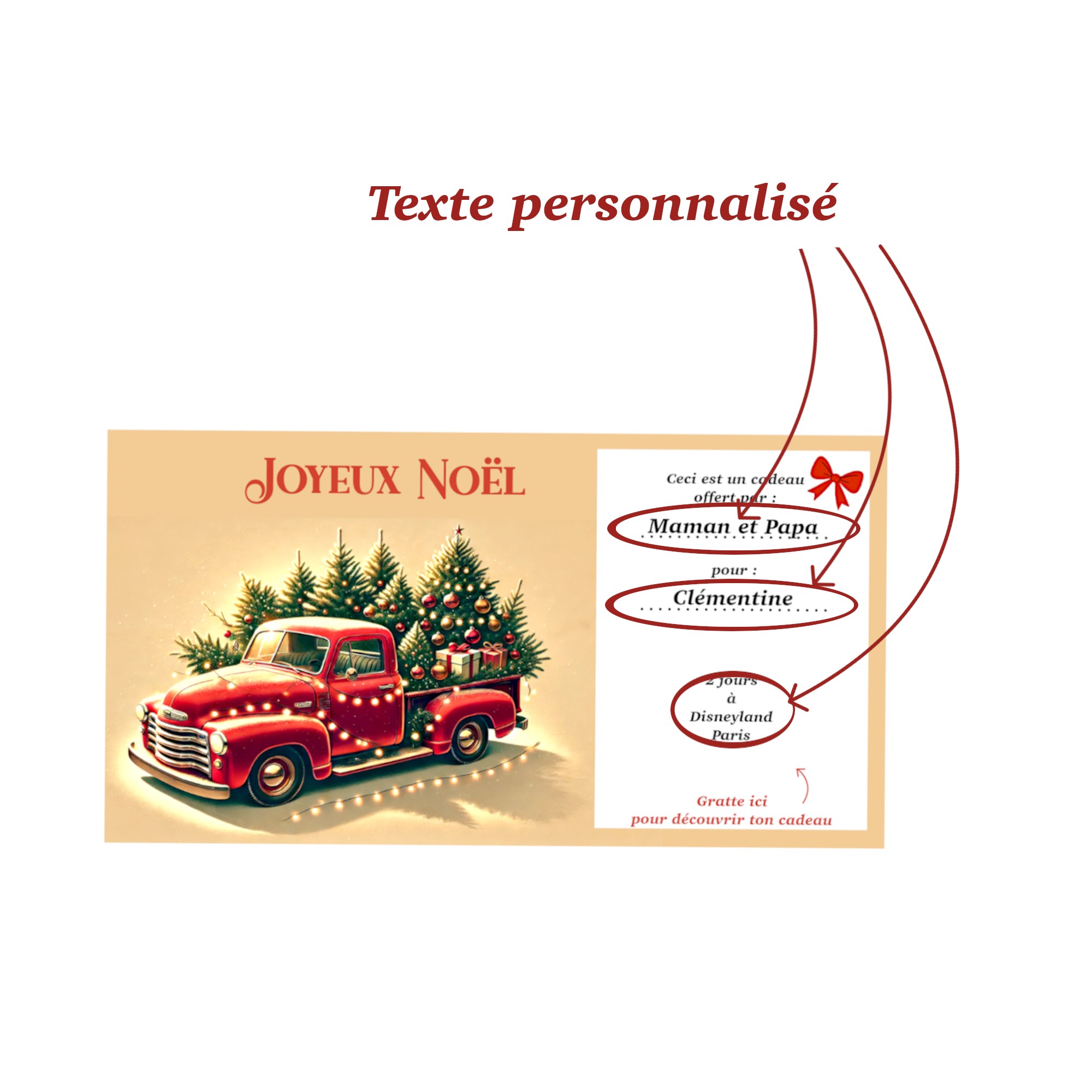 CARTE À GRATTER PERSONNALISÉE - MESSAGE CADEAU DE NOËL, VOYAGE SURPRISE - MOTIF VINTAGE CAMIONNETTE