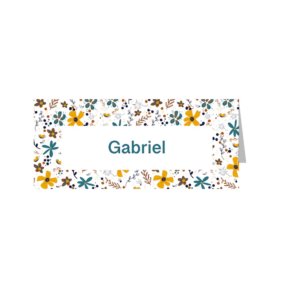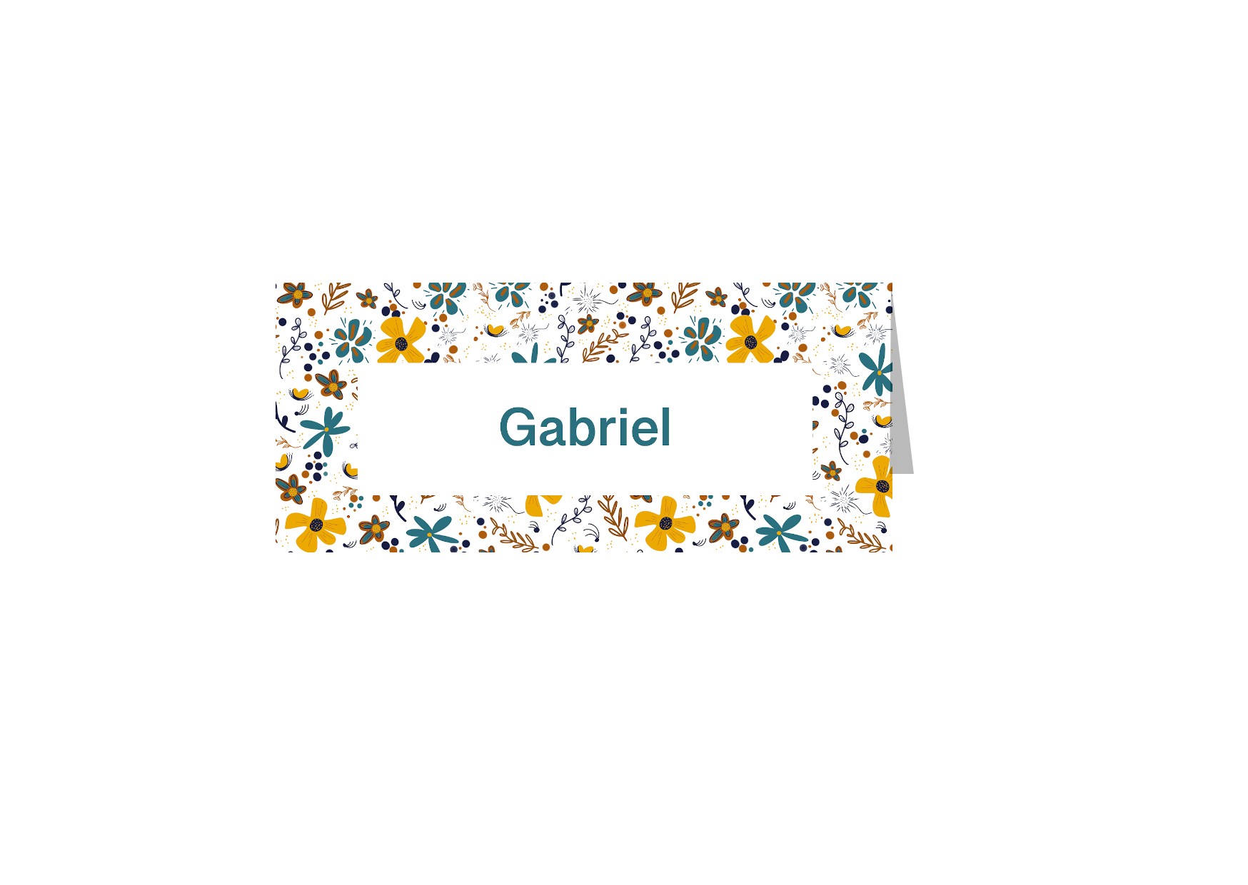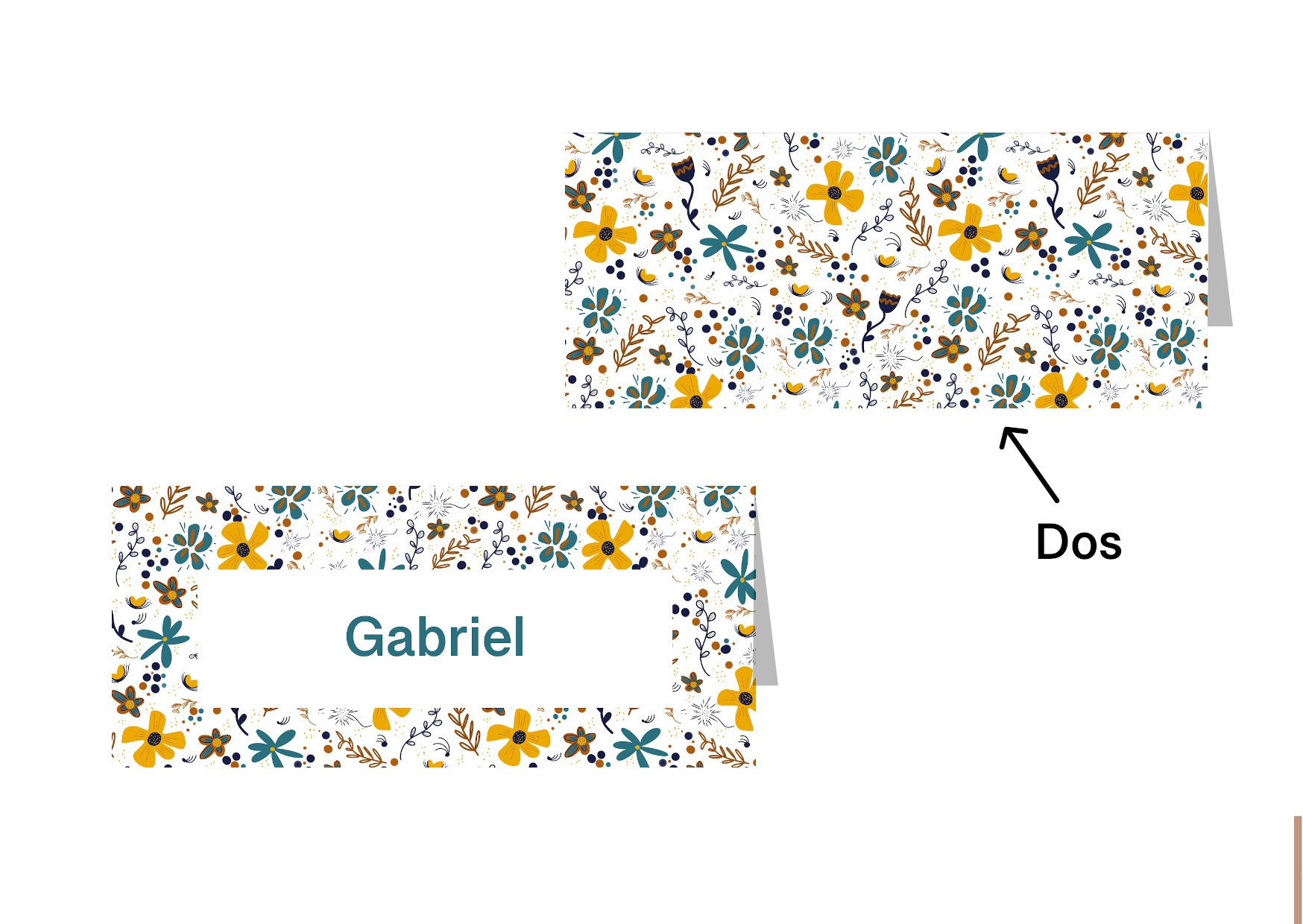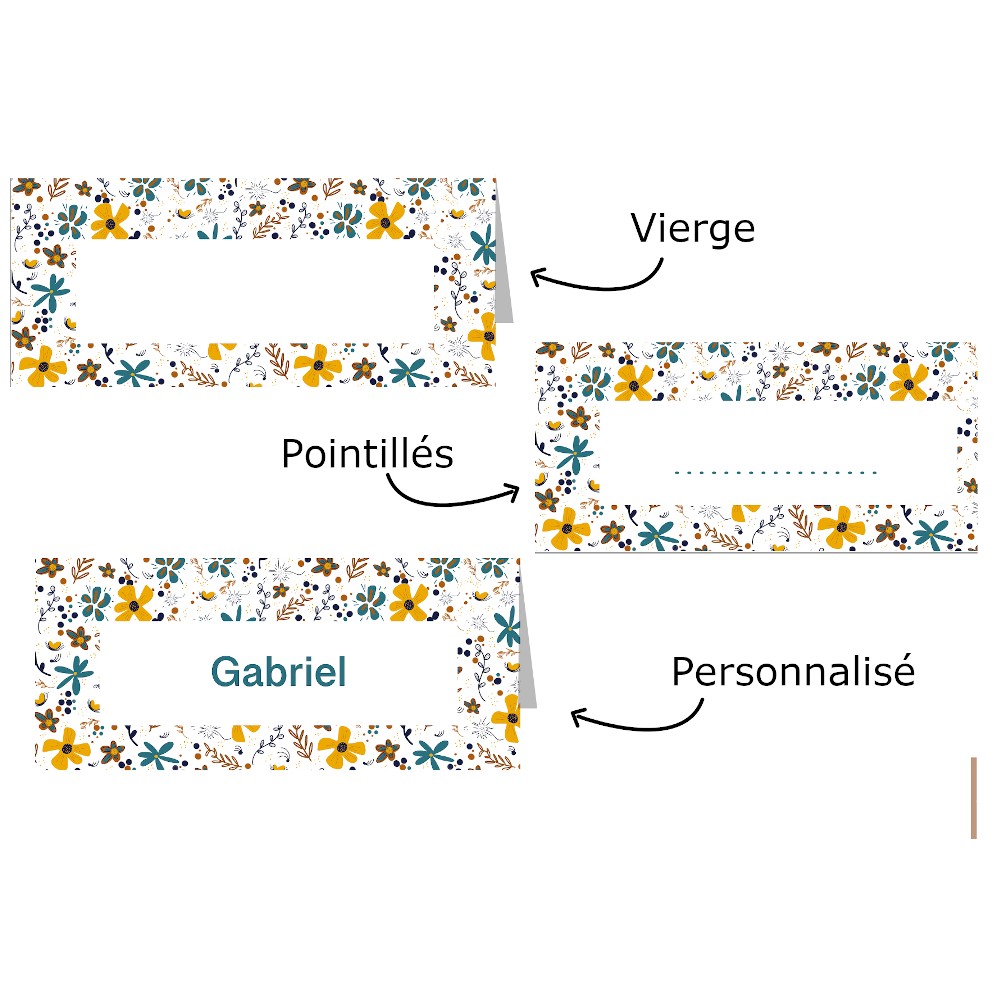 Marque-places blancs aux jolis motifs floraux style liberty, petites fleurs bleues et jaunes, à déposer sur vos tables.