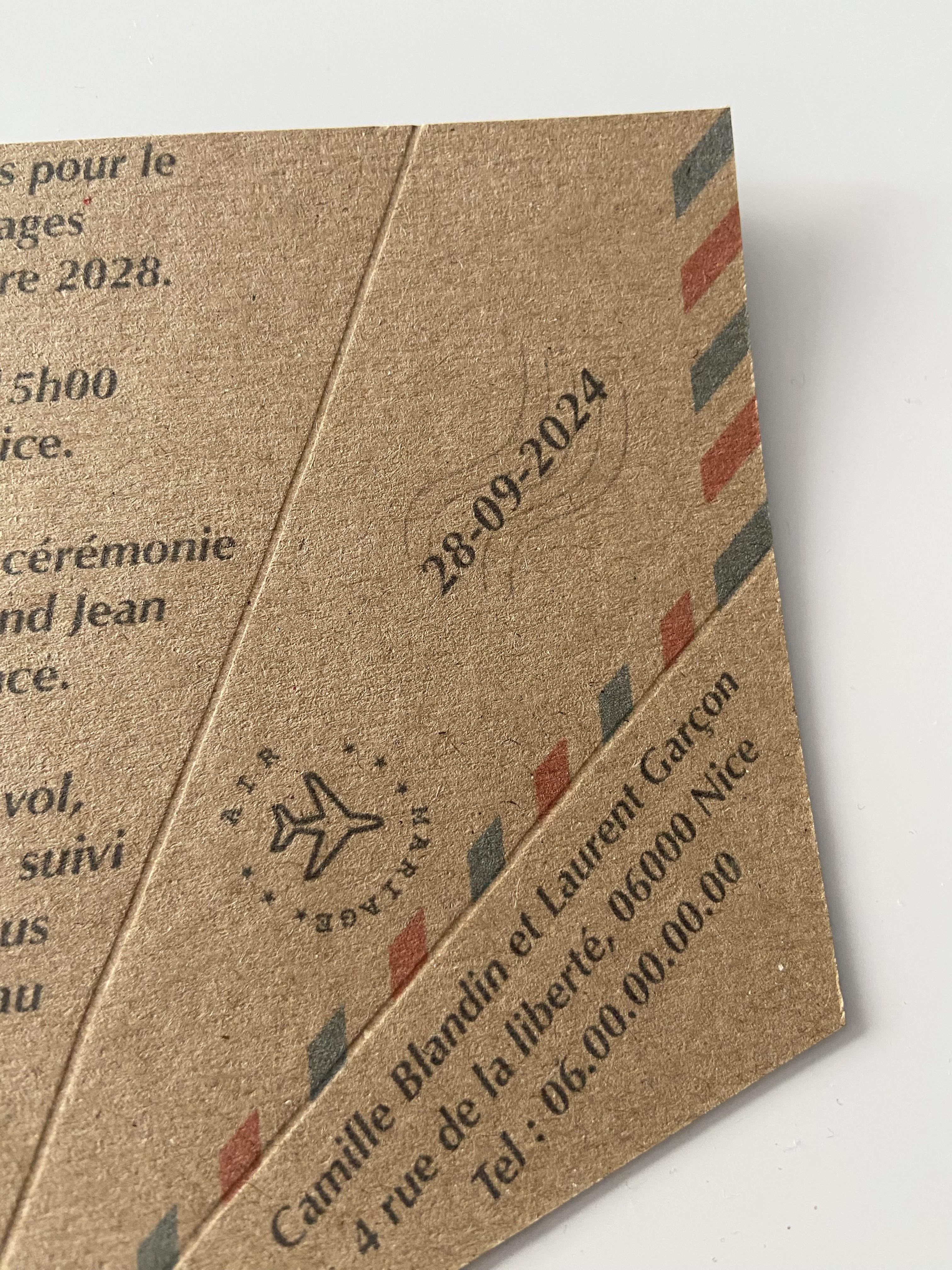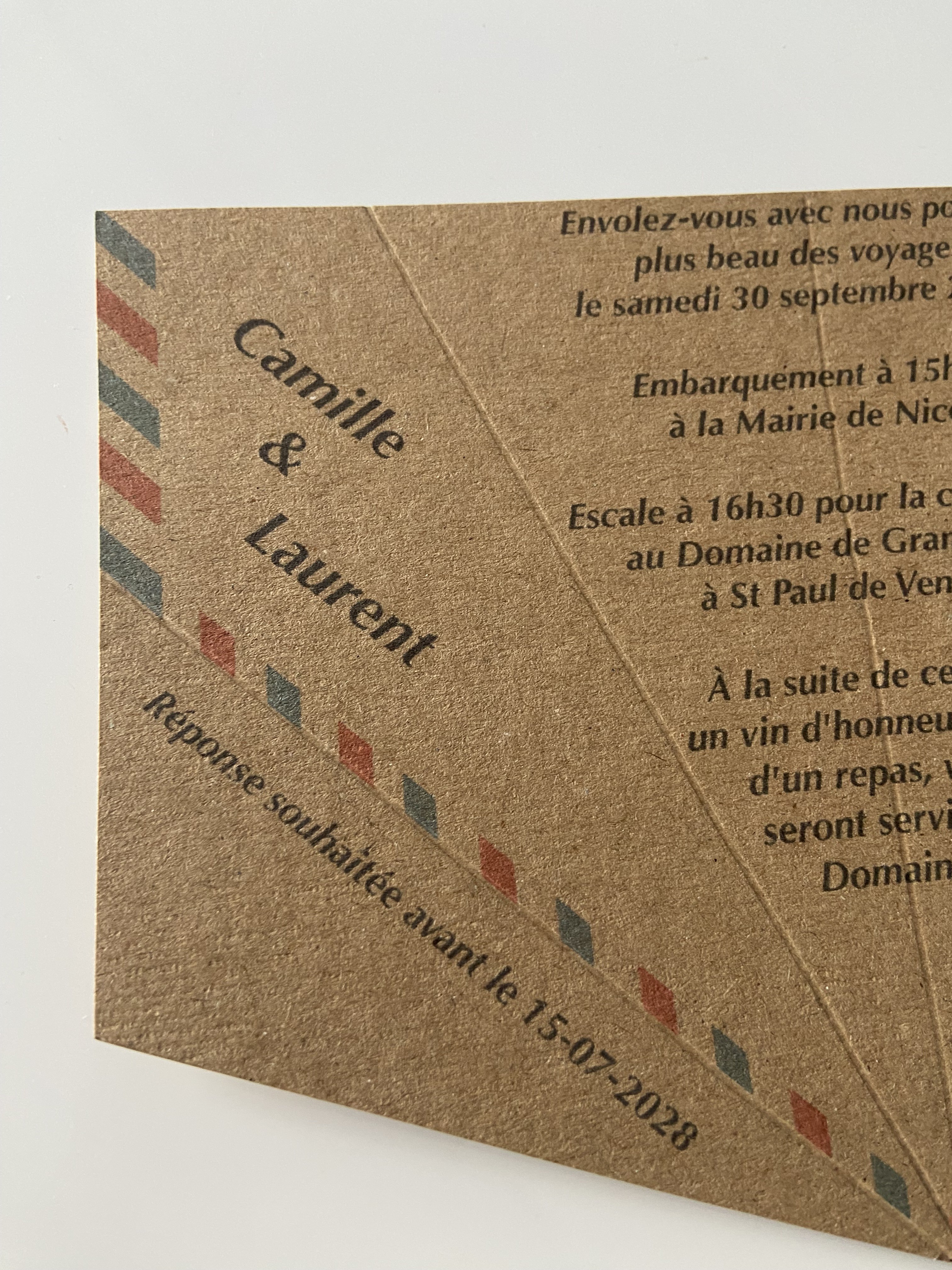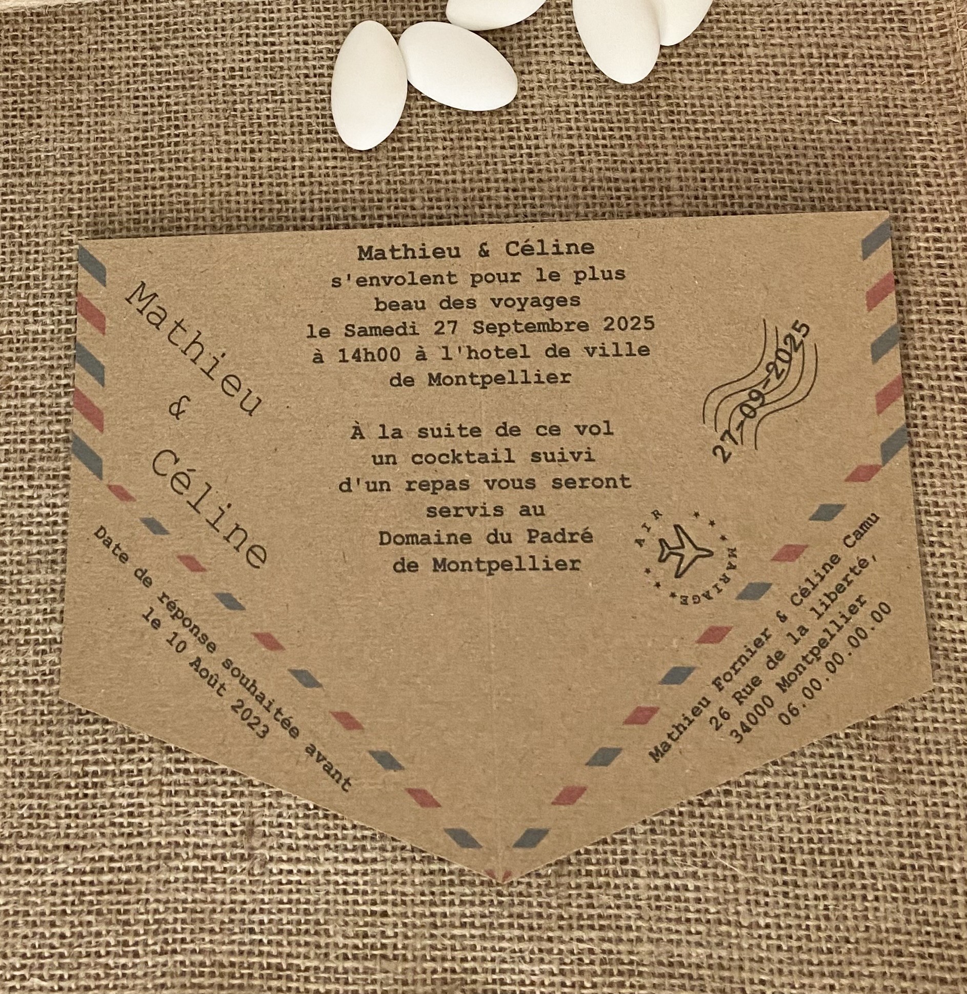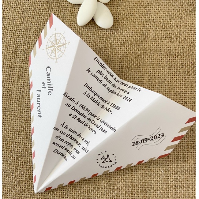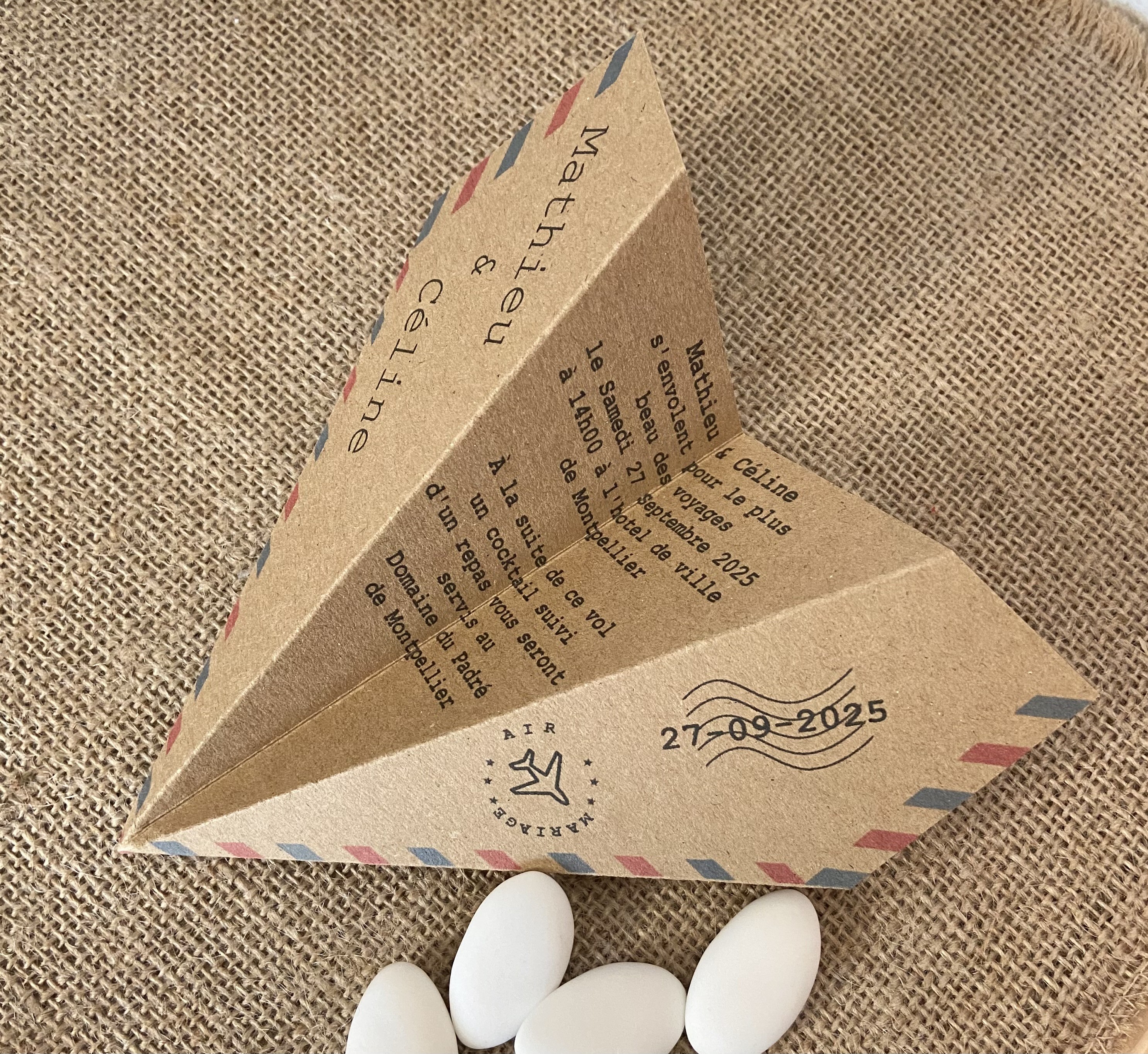 FAIRE-PART, INVITATION MARIAGE THÈME VOYAGE, DESTINATION - ORIGAMI AVION - VERSION KRAFT NATUREL