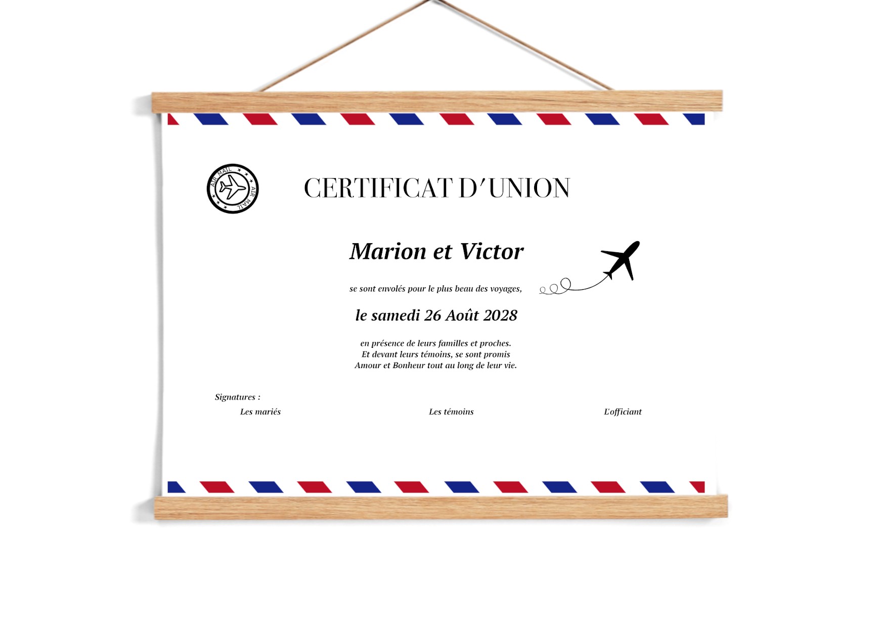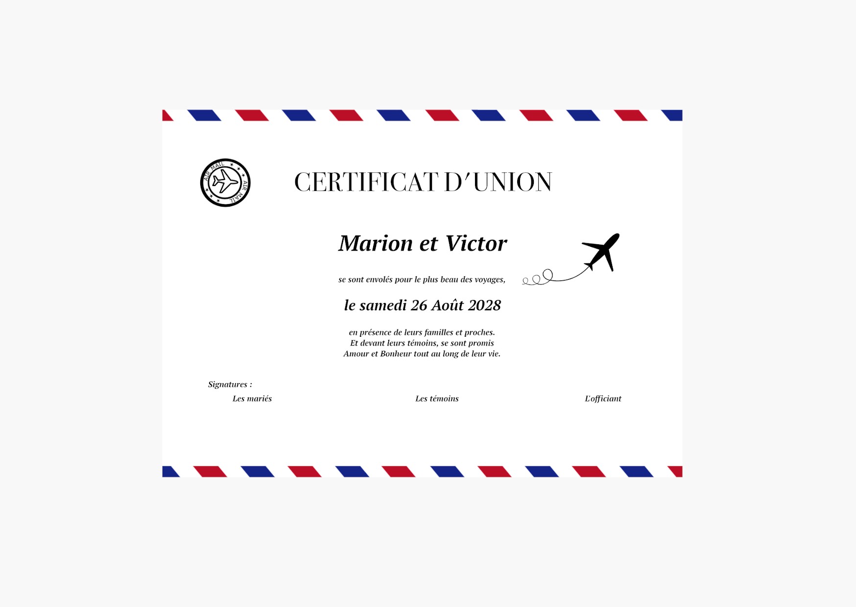 CERTIFICAT D'UNION - MARIAGE LAÏQUE - MARIAGE THEME DESTINATION/VOYAGE - STYLE BILLET D'AVION