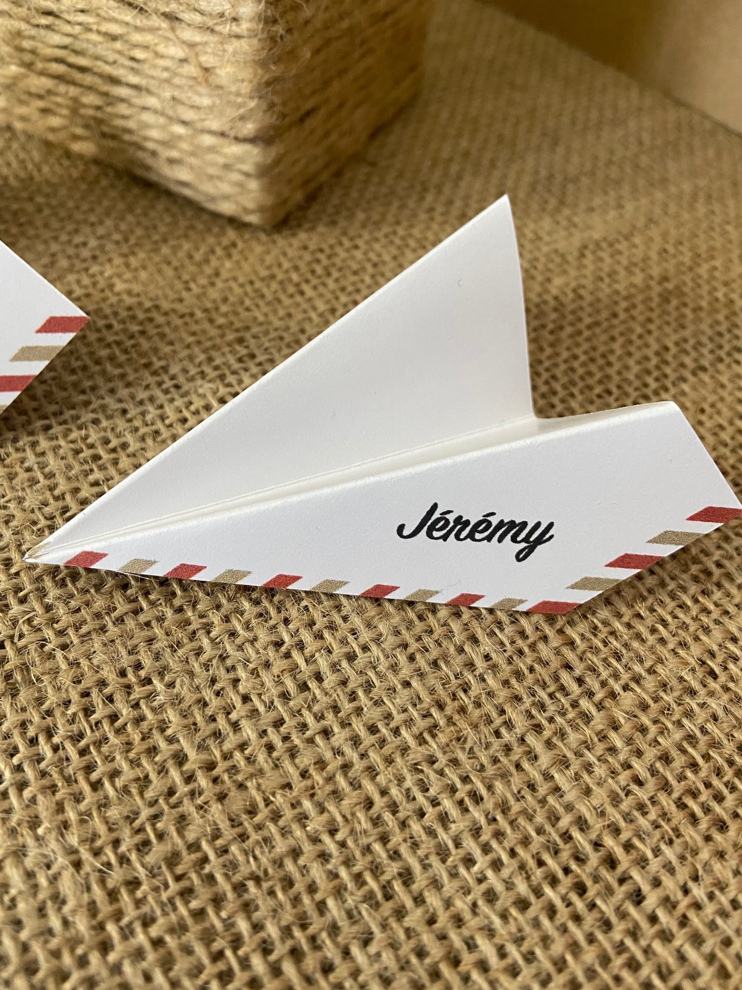 Marque-places en origami avion, parfait pour un mariage ou anniversaire sur le thème du voyage.