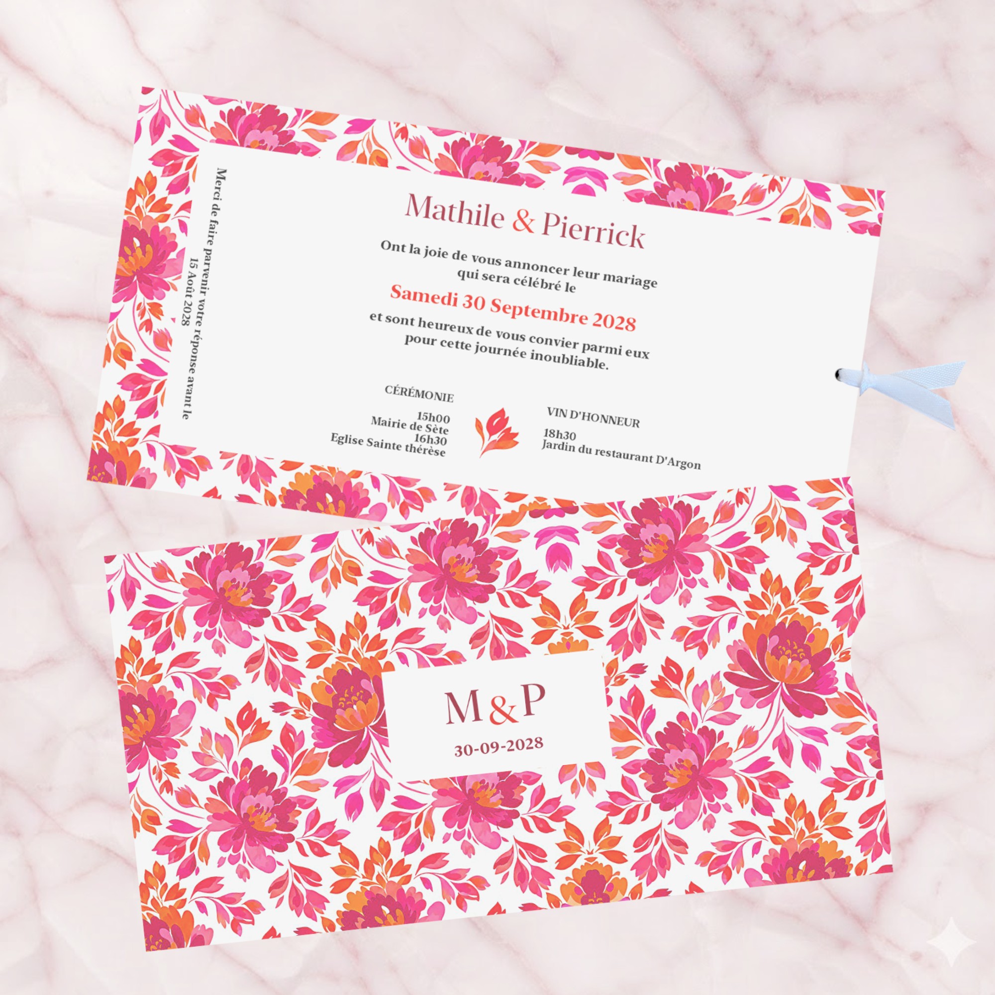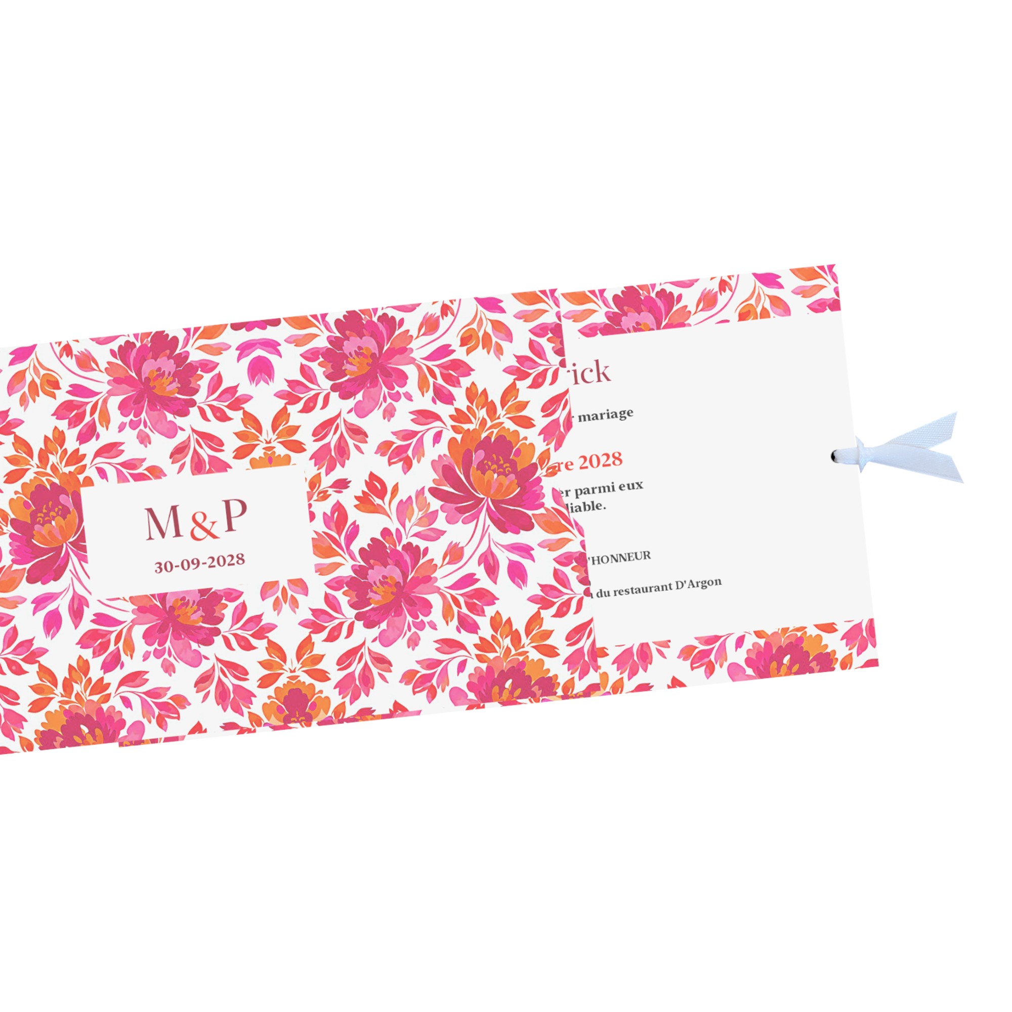 Invitation pour mariage romantic folk, style folk art avec son motif aquarelle floral répétitif rose et orange pour une inspiration botanique romantique