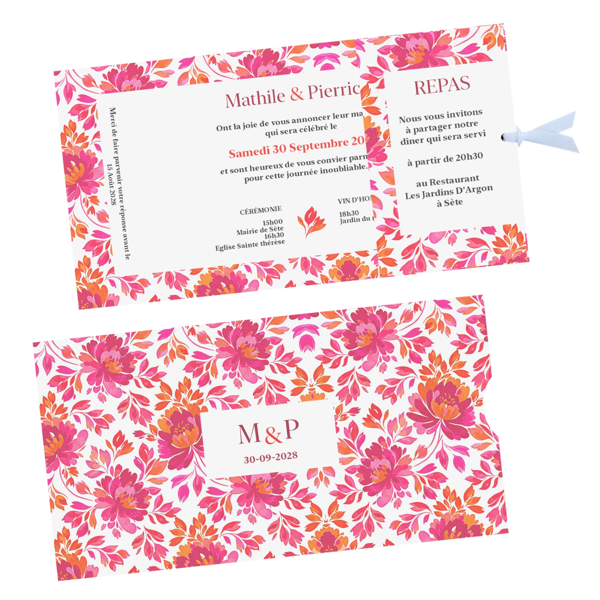 Invitation pour mariage romantic folk, style folk art avec son motif aquarelle floral répétitif rose et orange pour une inspiration botanique romantique