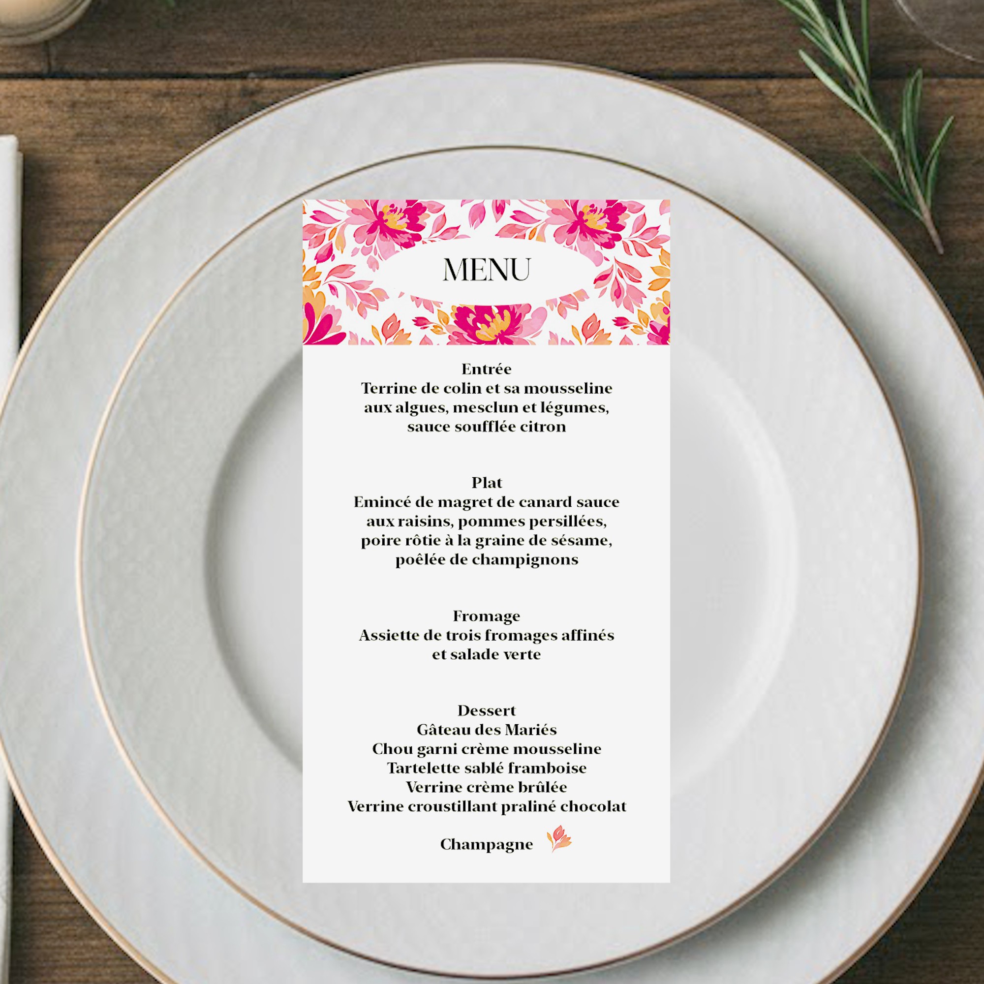 CARTE MENU PERSONNALISÉE - MARIAGE OU ANNIVERSAIRE THEME BOTANIQUE ROMANTIQUE - FORMAT ALLONGÉ