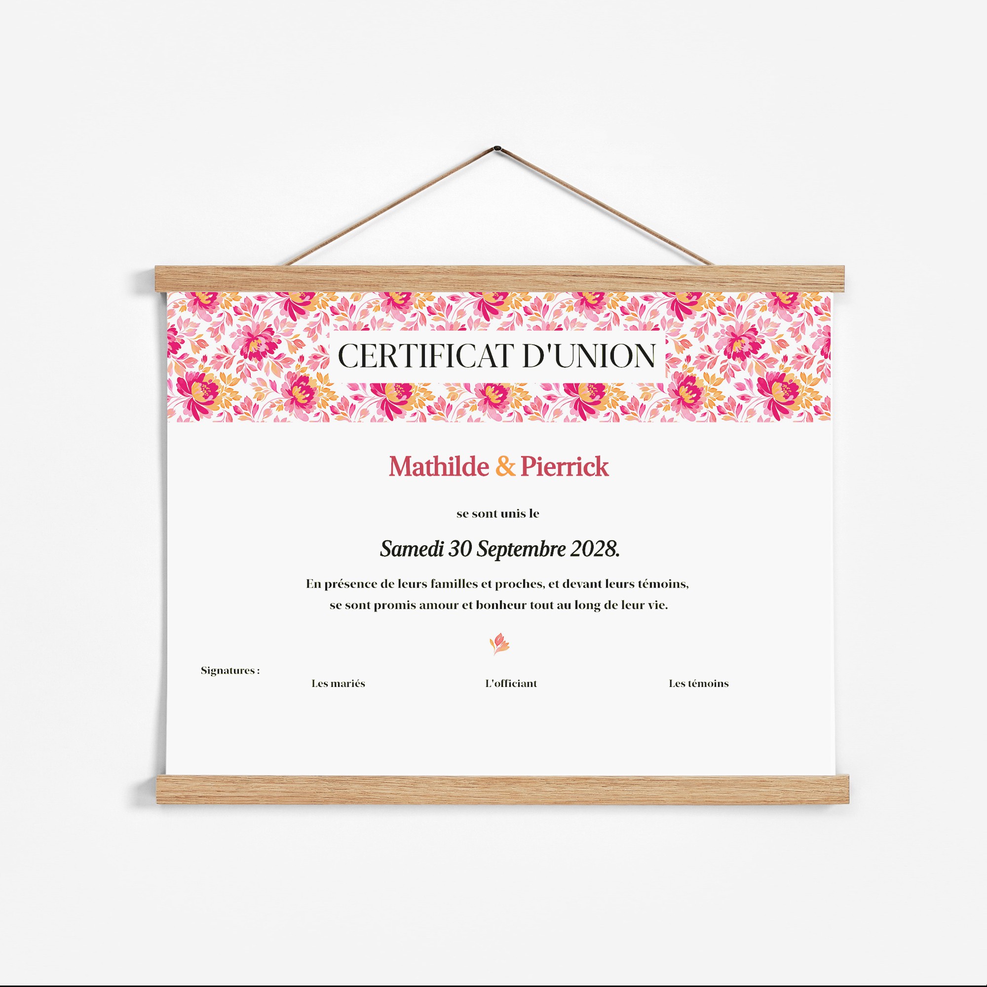 Certificat personnalisé pour votre cérémonie Laïque, qui vous permettra de garder un souvenir précieux de ce joli moment.