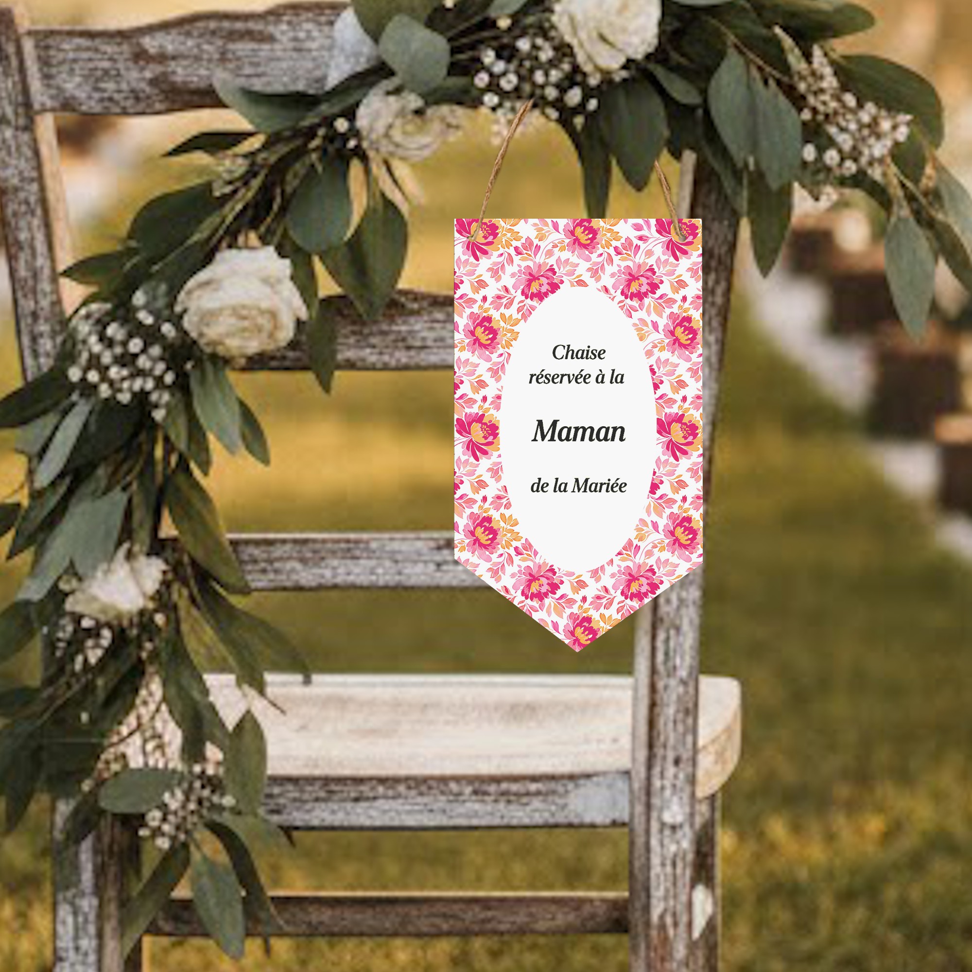 En ce jour unique, il est important que les personnes qui nous sont les plus chères soient au plus près de soi... Voici de quoi en être sûr avec cette pancarte sur lequel sera noté le texte de votre choix (Chaise réservée à la maman de la mariée, au témoin, au papa...)