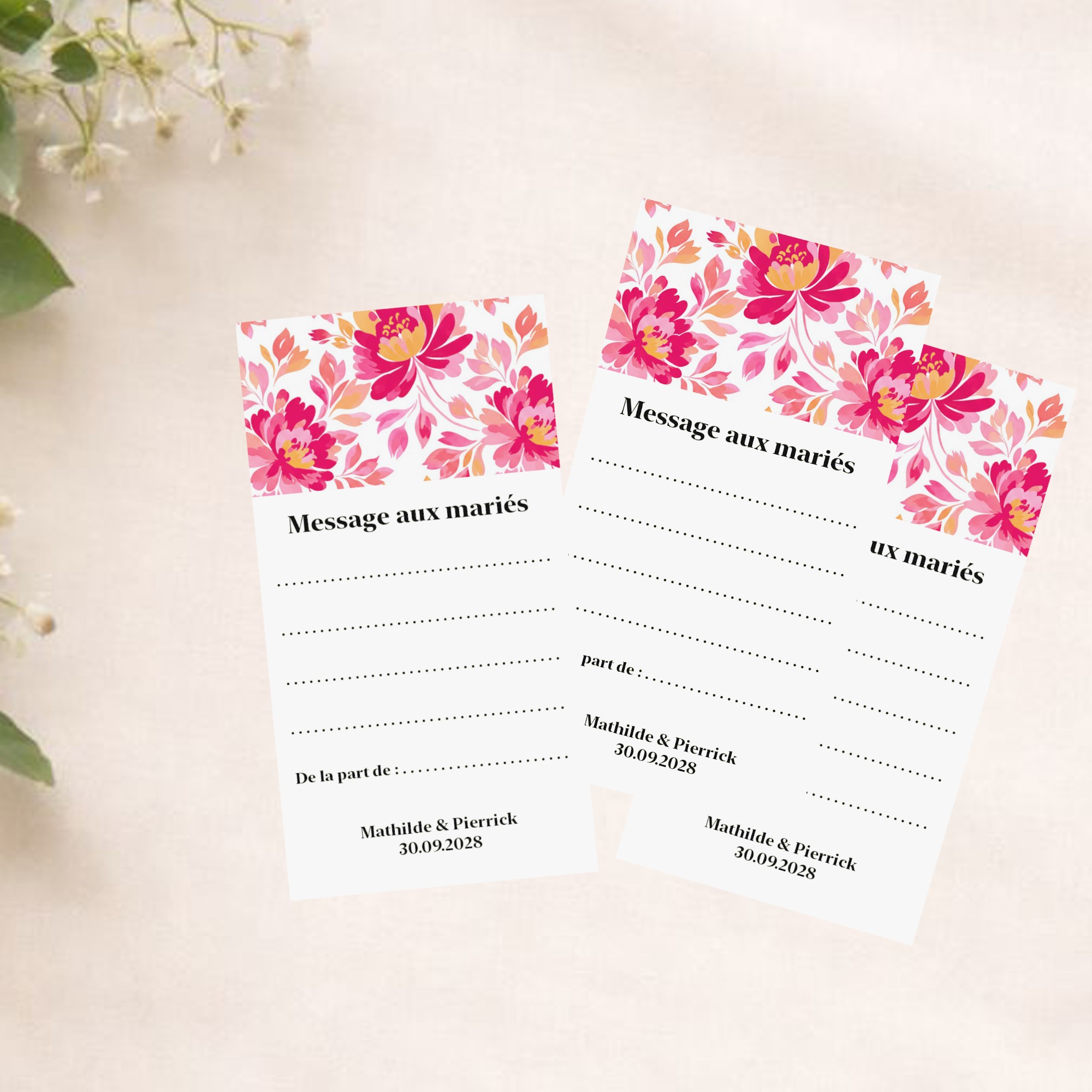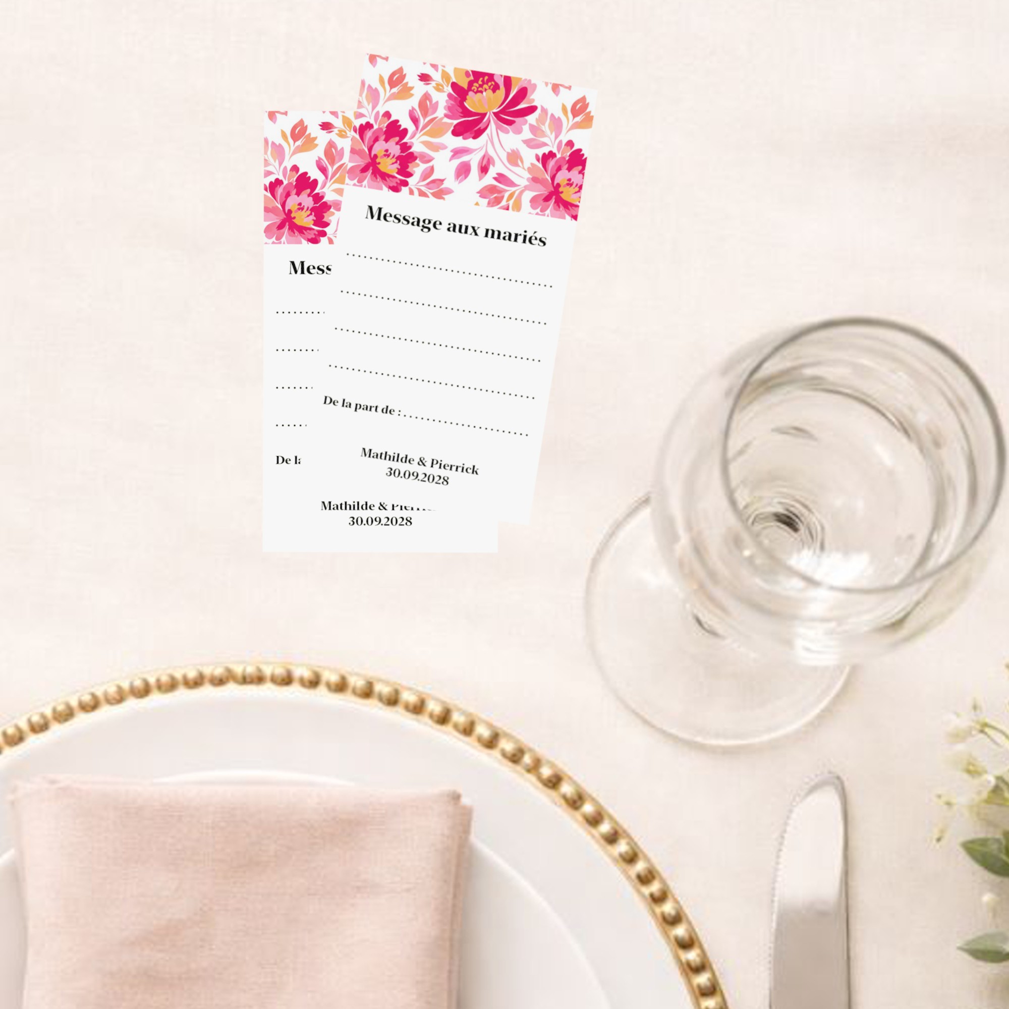 « Message aux marié(e)s » à mettre à disposition sur vos tables afin que vos invités puissent les remplir de petits messages et bons souvenirs...