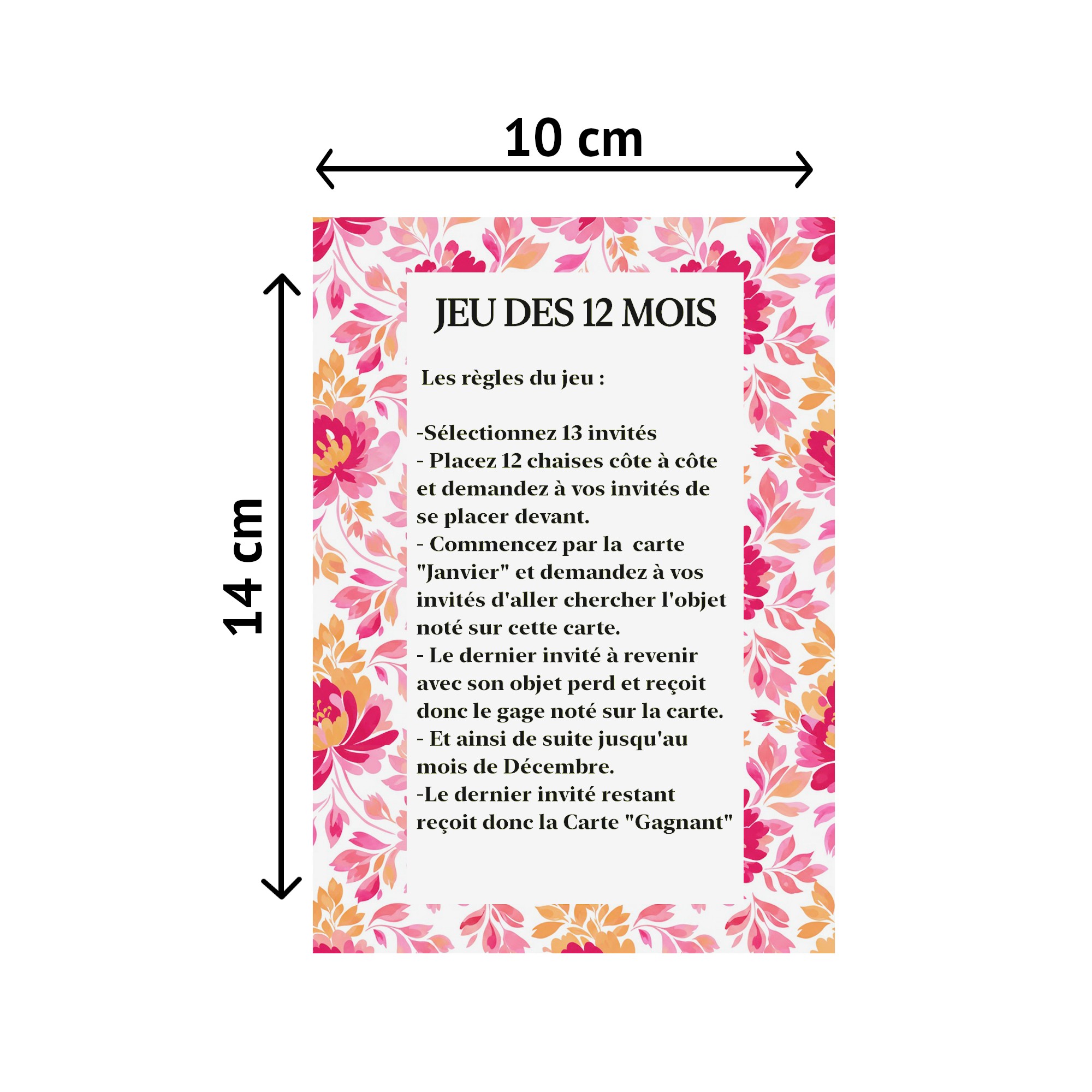Sur chaque carte 1 mois, 1 objet a rapporter, et 1 gage.
