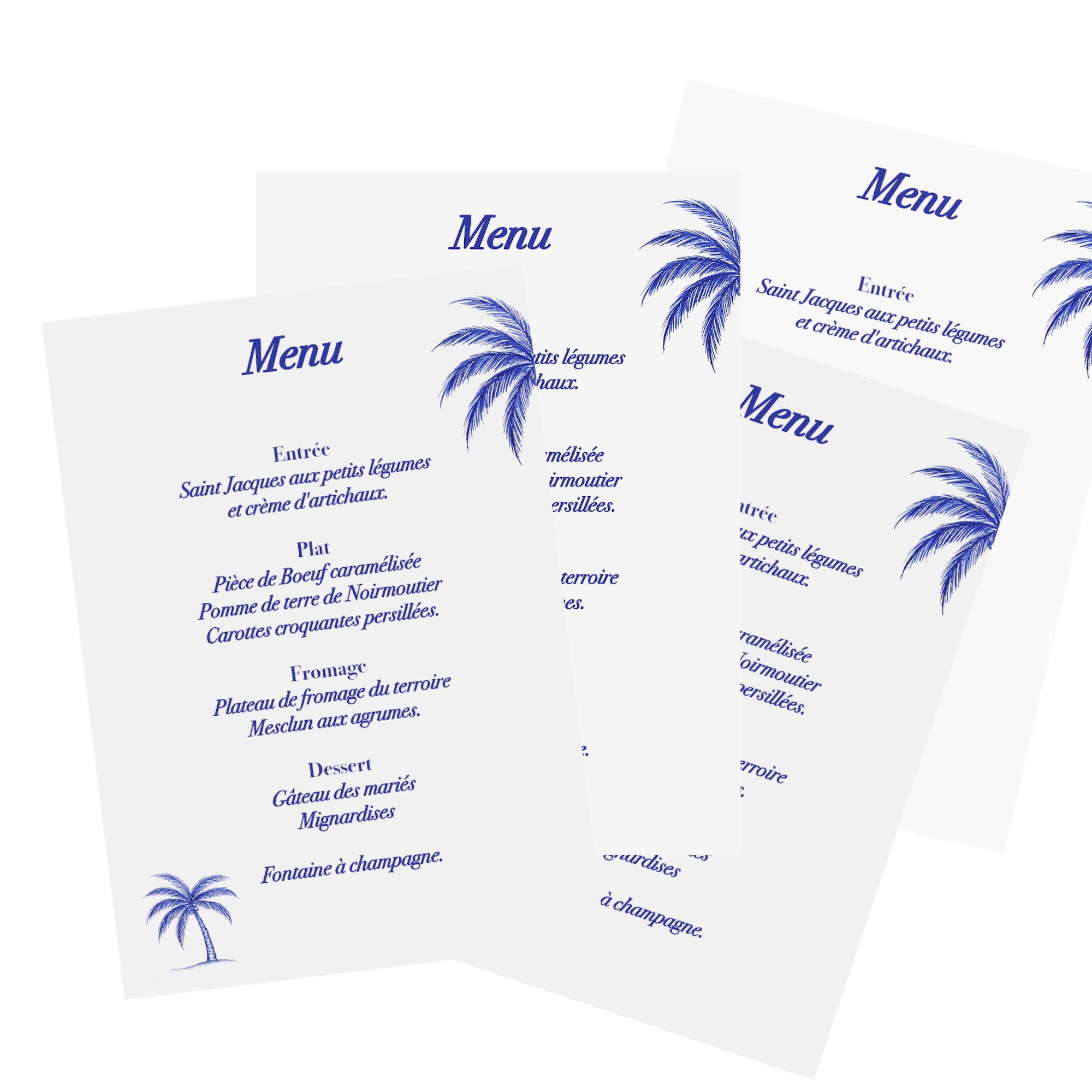 Carte Menu pour mariage thème Plage et tropiques au motif Palmier bleu, à disposer sur vos tables.