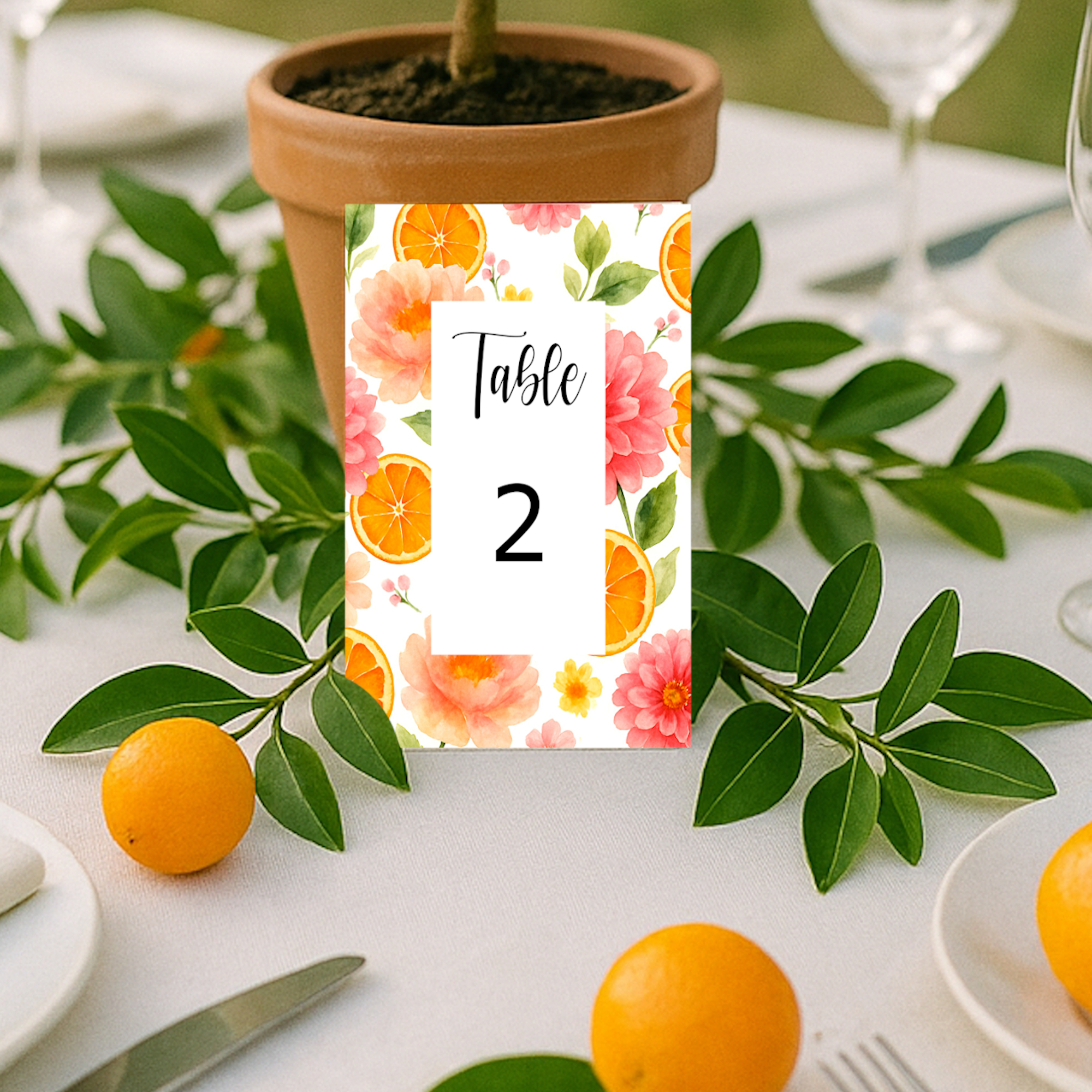 Carte Numéro de table personnalisée - Décoration Mariage Floral, nature - Motif Orange et fleurs colorées